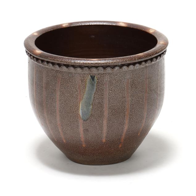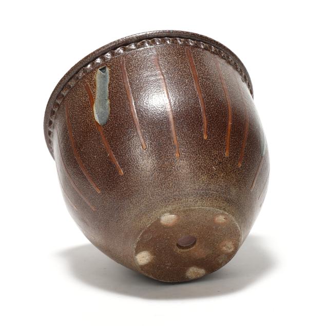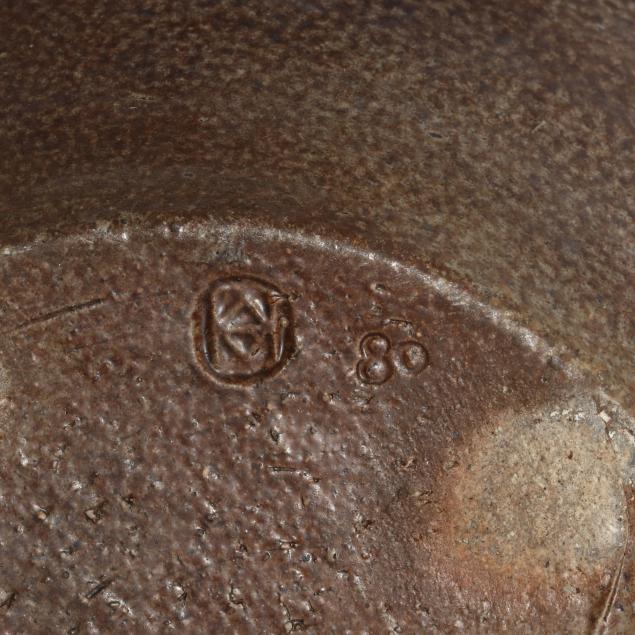 Pittsboro, salt glazed stoneware in deep brown glaze with copper toned runs, accented with controlled glass runs descending from stamped triangles to shoulder, marked with 1995-current potter's cipher and 80th firing mark to underside.