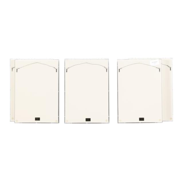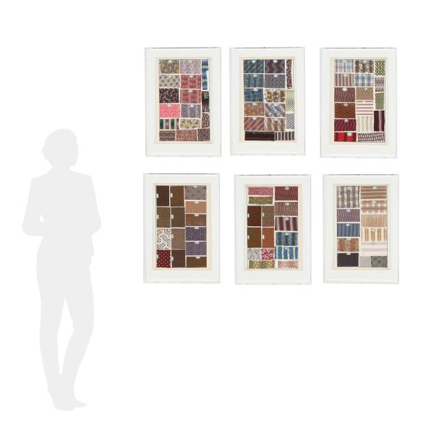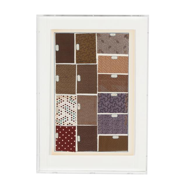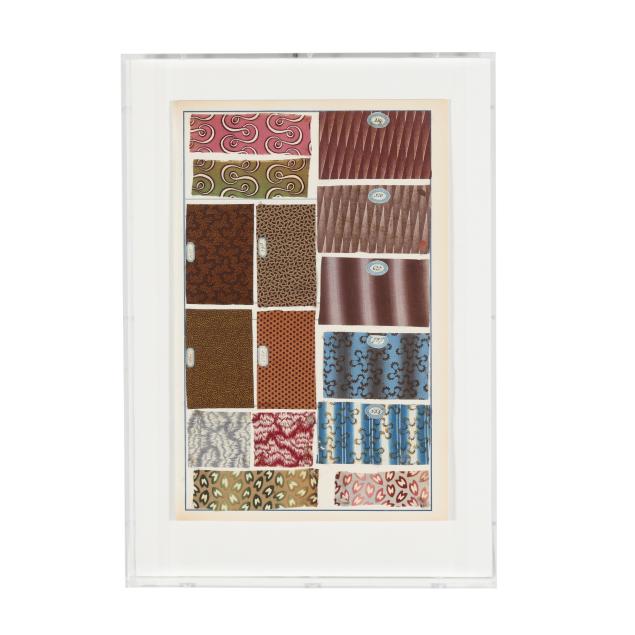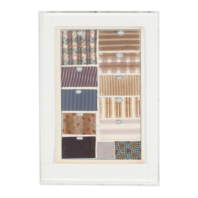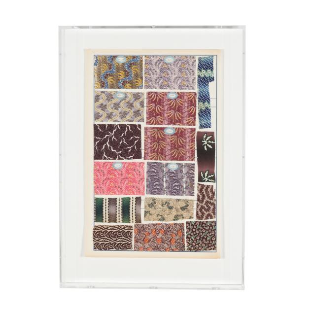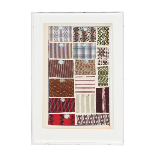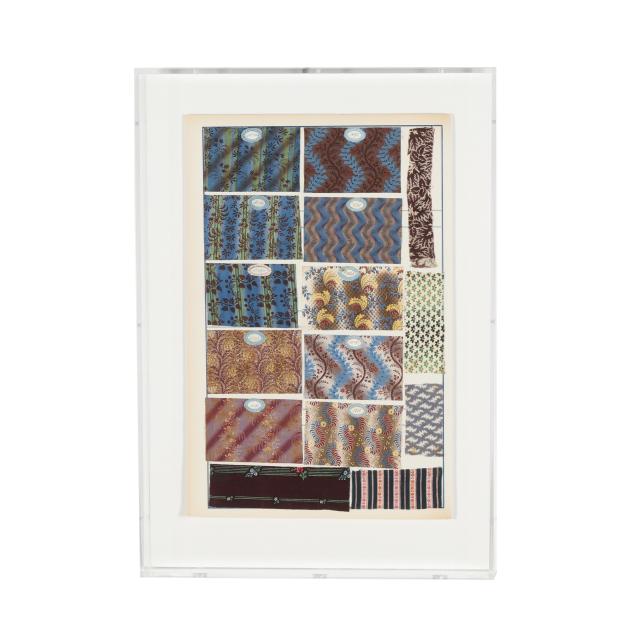Likely French, swatches of block printed cotton in various patterns and colorways are affixed to sheets and presented within custom made acrylic box frames.