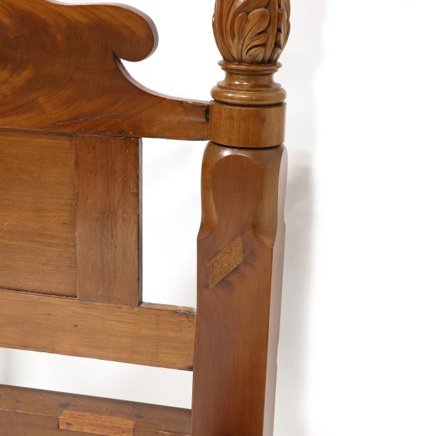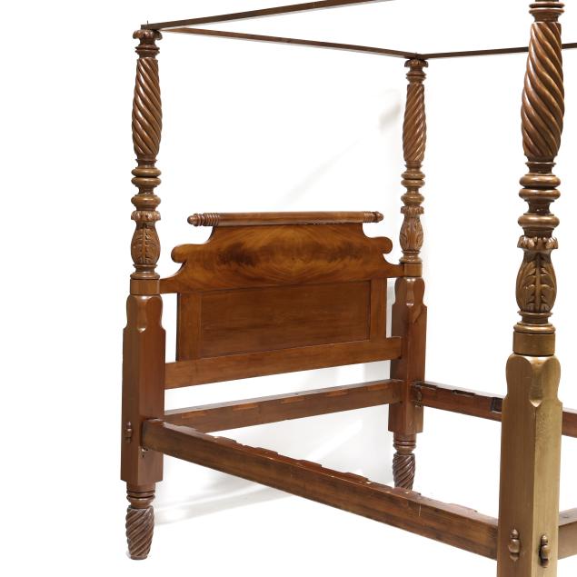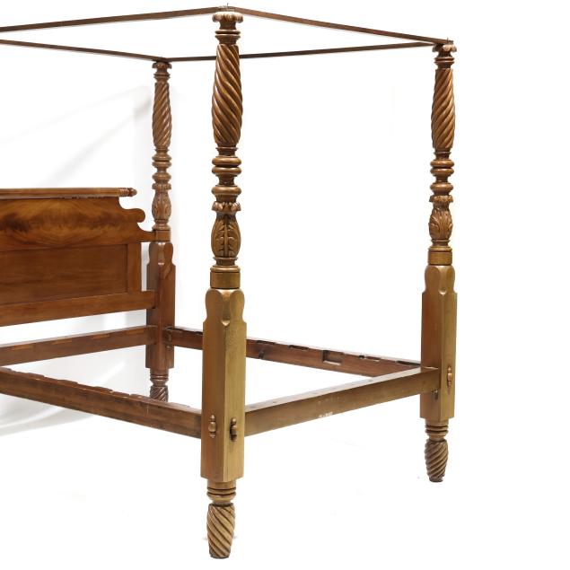 Circa 1840, mahogany, mahogany veneer, spiral twist and acanthus carved posts, plain tester, shaped headboard with turned crest rail over book-matched flame mahogany panels, spiral twist feet, with wood rails and bolts.