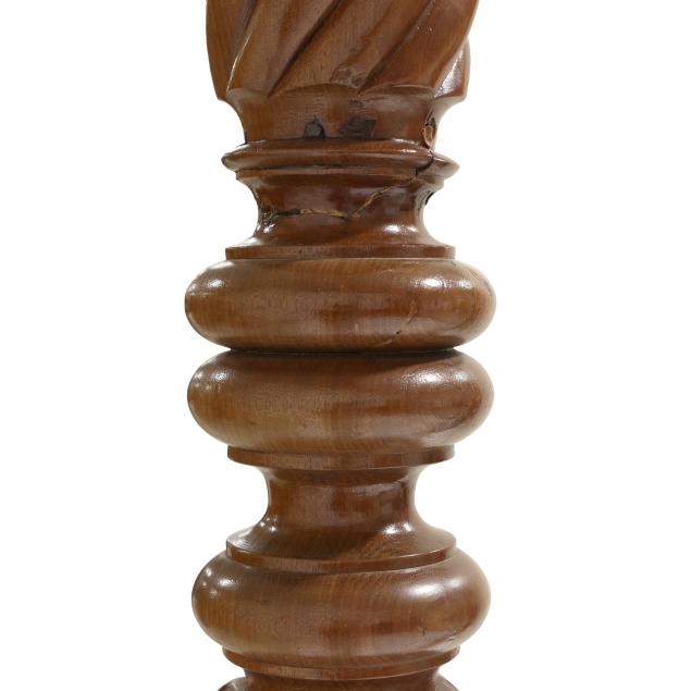 Footboard left post with break and repair below spiral twist; rails with plugs from previous slat and rope twist knob placements; tester pins have been bent flat.