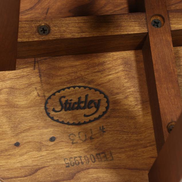 Late 20th century, through tenon joinery, four straight legs with cross stretcher, labeled.