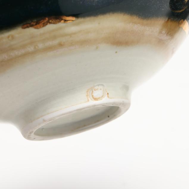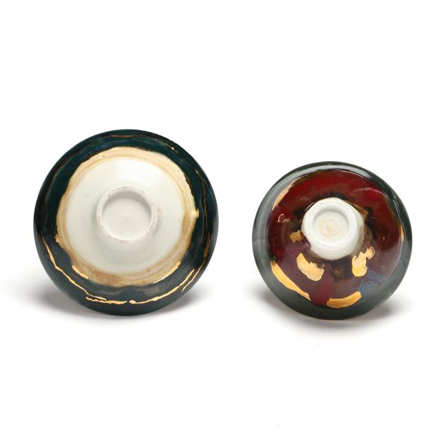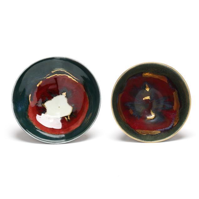Late 20th century, wheel-thrown porcelain with red and blue glazes and gilt luster accents, the first a tall footed bowl with gilt rim, artist stamped "SP" to underside (4 x 7 1/2 x 7 1/2 in.), the second a low footed bowl, with artist's stamp "SP" to base (2 3/4 x 8 3/4 x 8 3/4 in.).
