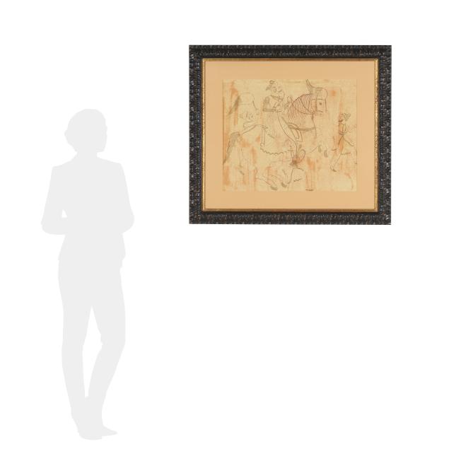 kamarband, three attedants walk alongside him, beautifully framed under glass with a tan mat in a heavy carved dark wood frame.