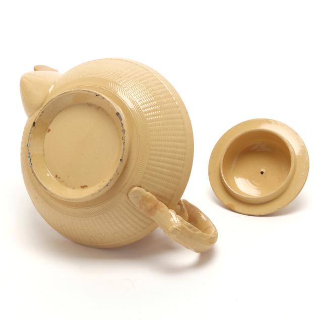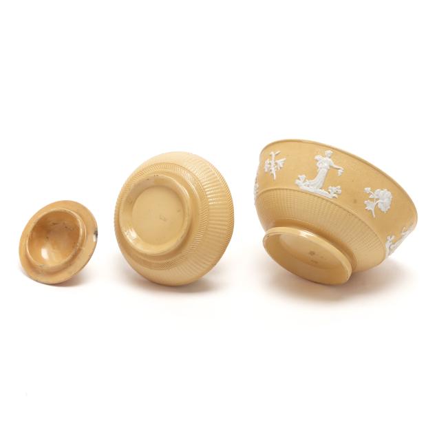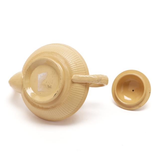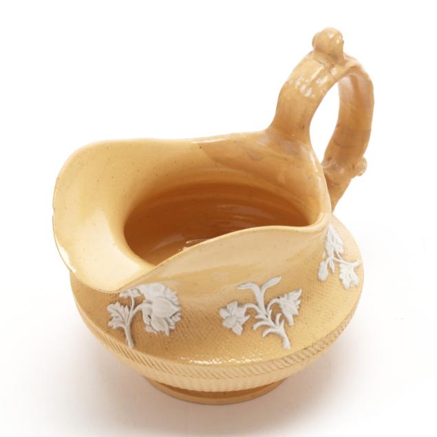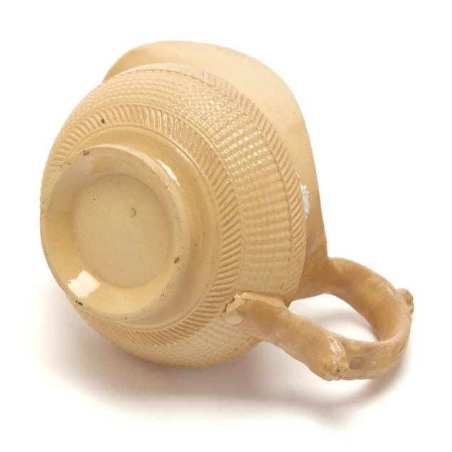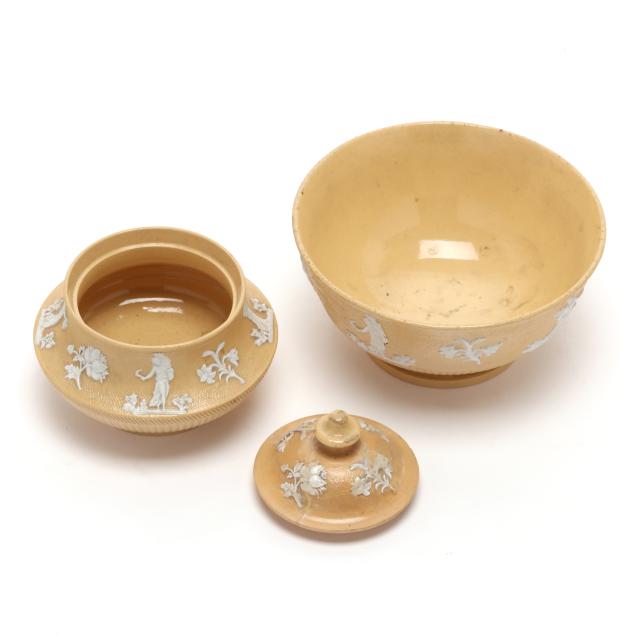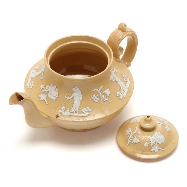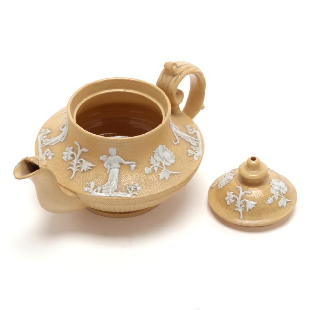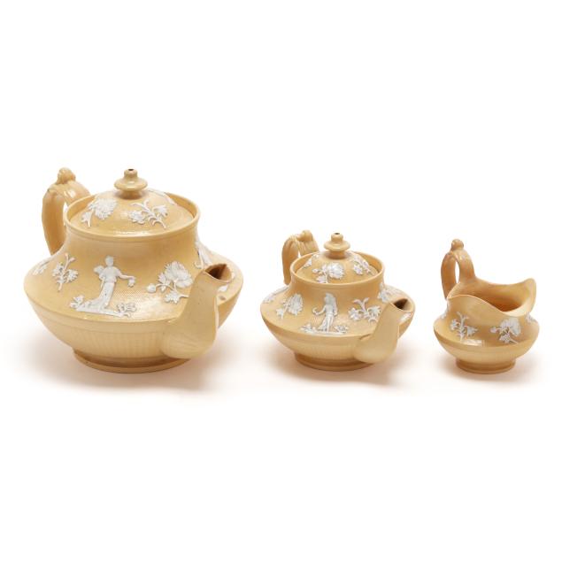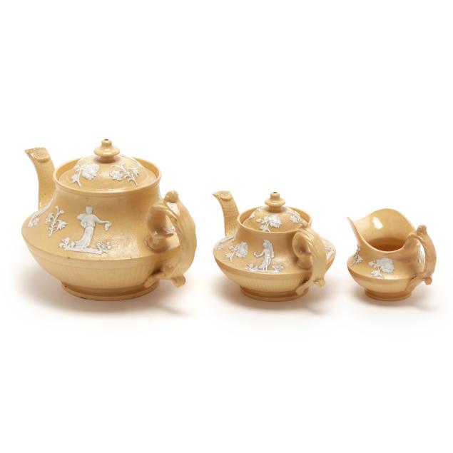 English, first half 19th century, lead glazed ceramic with molded and applied white clay Classical figure and sprig relief decoration, to include a teapot (5 1/4 x 9 1/4 x 6 in.); a miniature teapot (3 3/4 6 1/4 x 4 1/4 in.); a creamer (3 x 4 1/4 x 3 in.); a covered sugar (3 1/2 x 3 3/4 in. diameter); and a footed bowl (2 3/8, 4 3/4 in. diameter), unmarked.