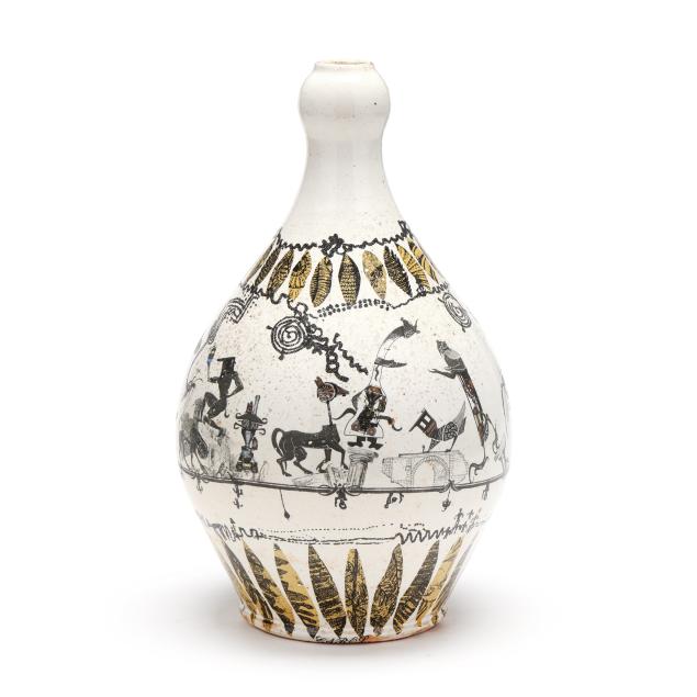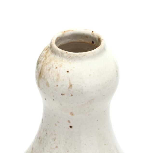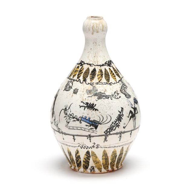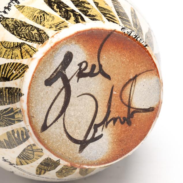 Seagrove, Johnston & Gentithes Studio, white glazed stoneware bulbous form bottle vase with budding capital, and transfer decoration to whole, signed "Fred Johnston" to underside and "CAROL" in transfer letters to the base.
