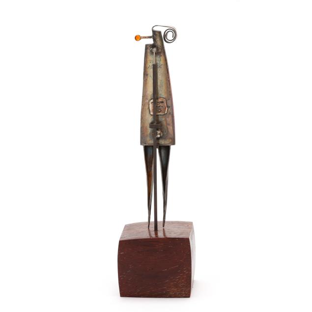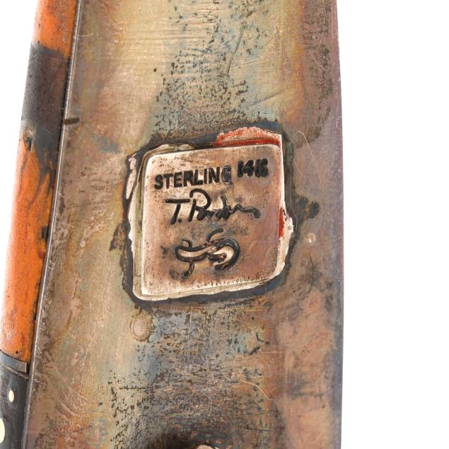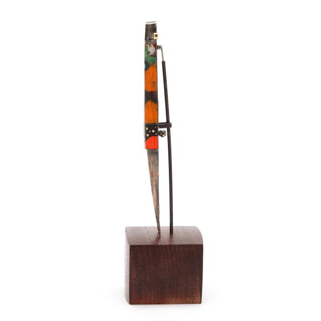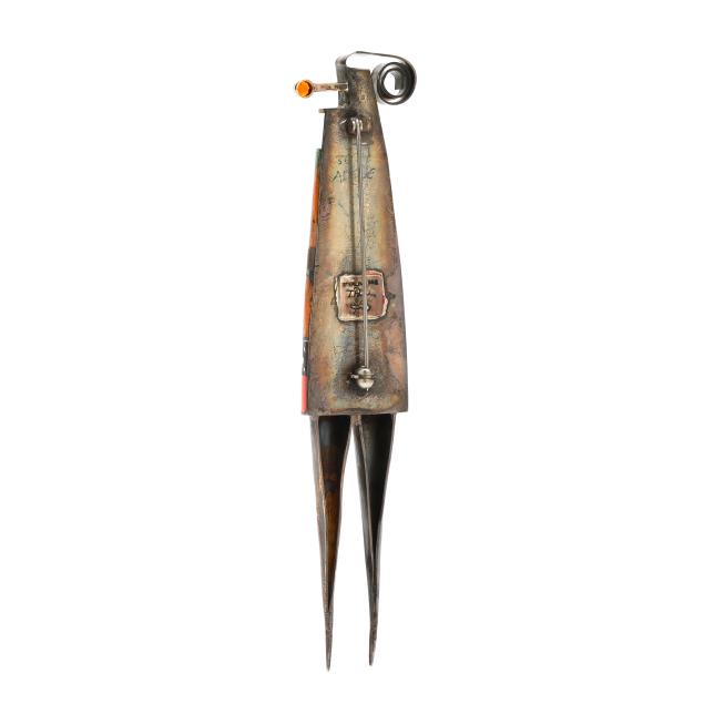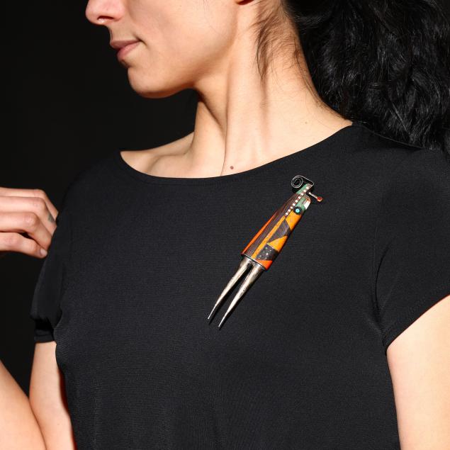The sterling silver brooch with gold accent, wood, enamel, and various inlays, signed, numbered 3694, and stamped Sterling 14K.