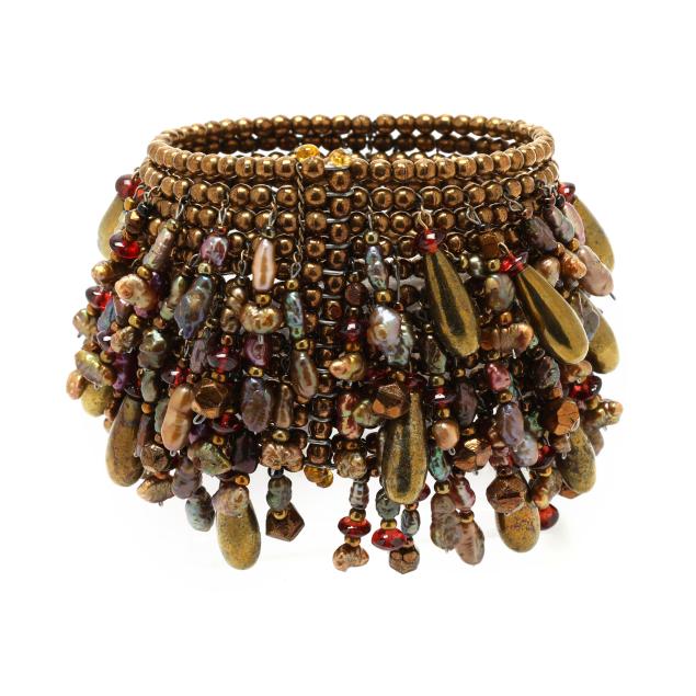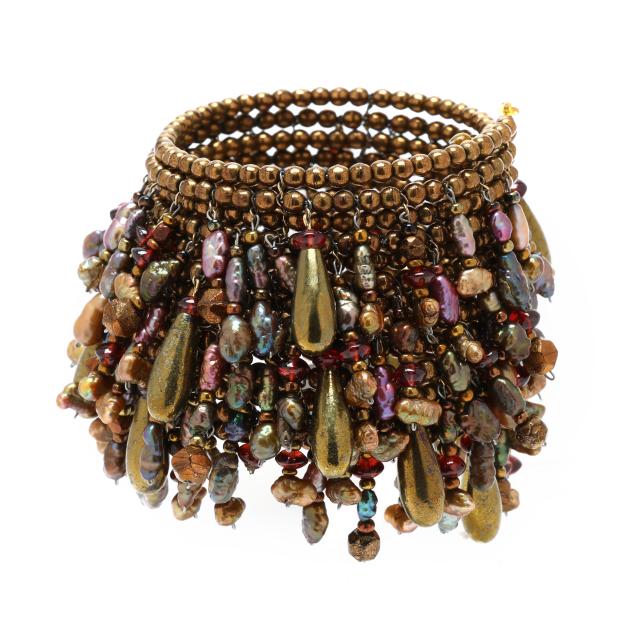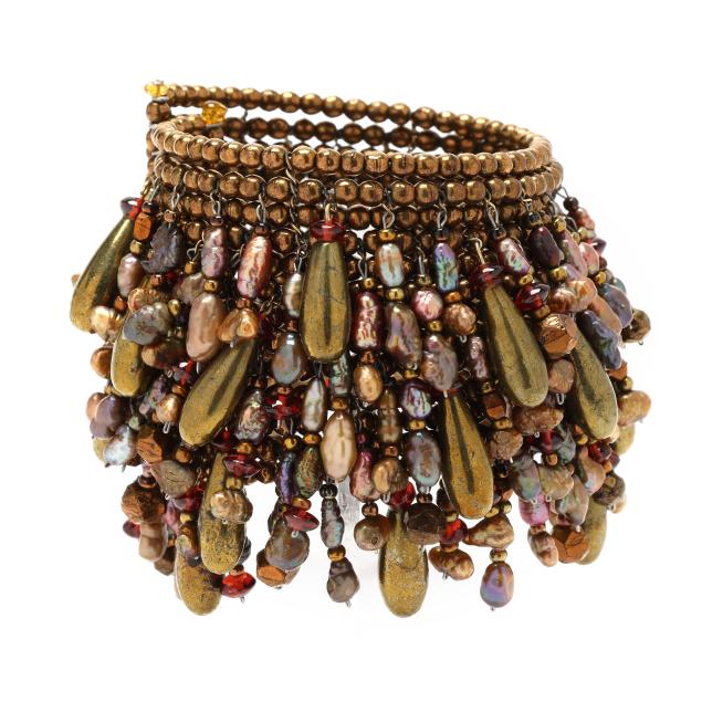 The multi-strand beaded cuff bracelet suspending dangles set with beads an seed pearls, appears unsigned.
