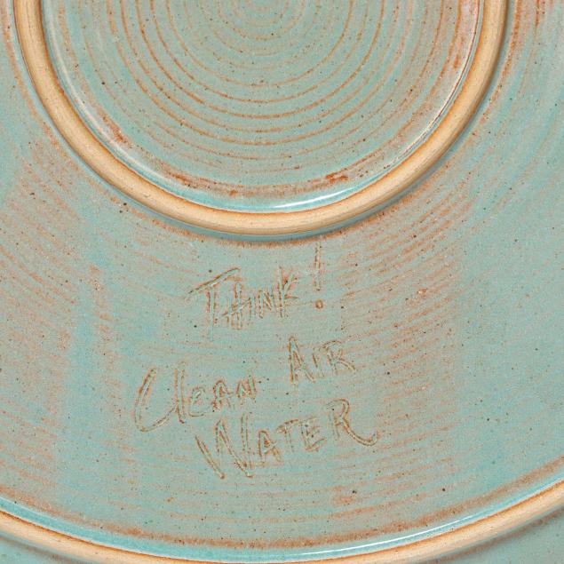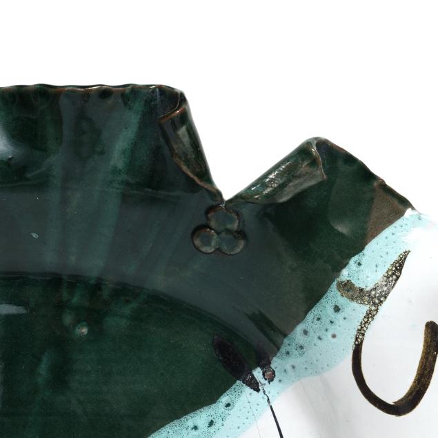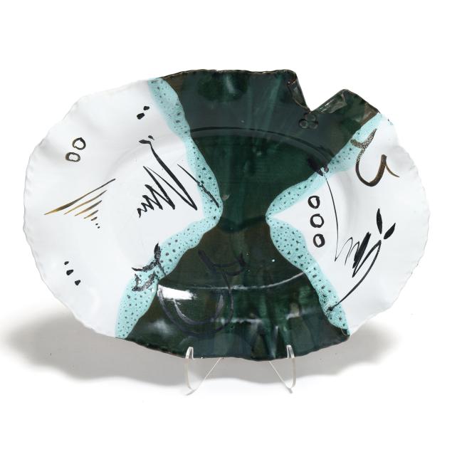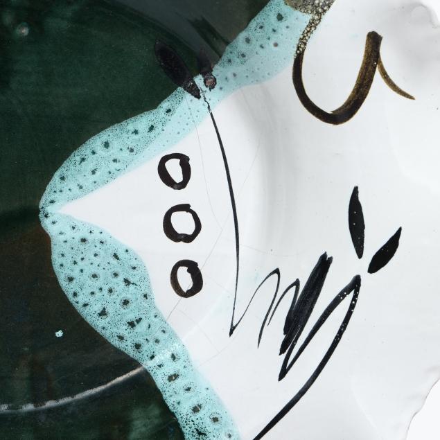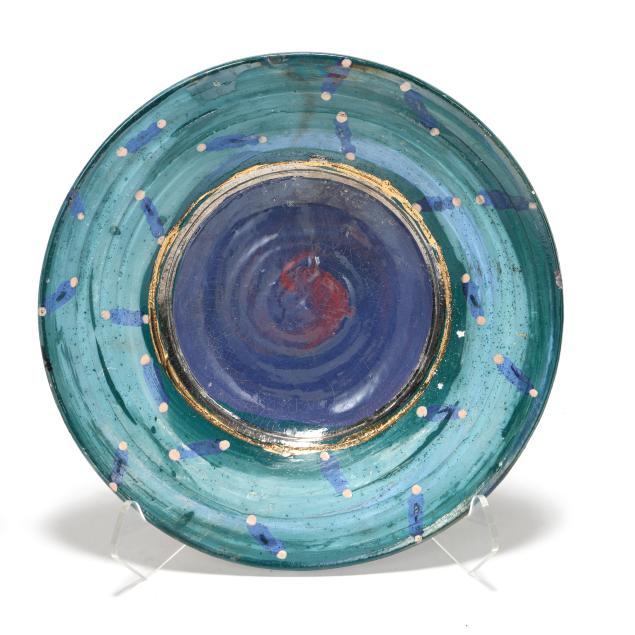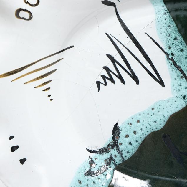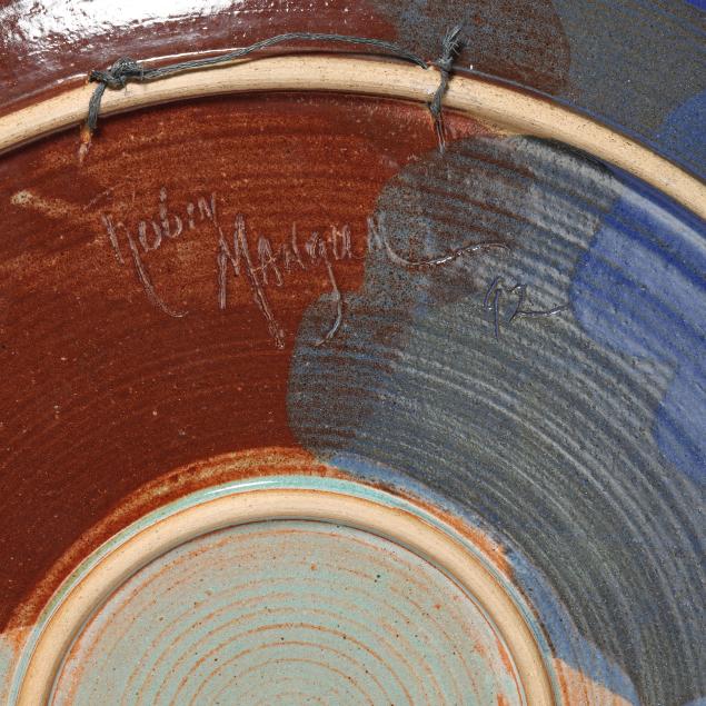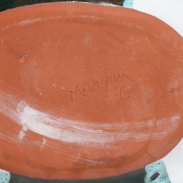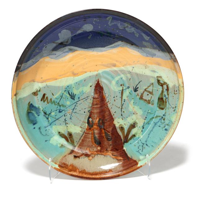 Late 20th century, including a multi-color glazed terra cotta oval tray with abstract decoration and scalloped rim, inscribed "MANGUM / 97" to underside (20 1/2 x 15 x 2 1/4 in.); a large circular stoneware charger with polychrome glazed decoration of a landscape, signed "Robyn Mangum 92 / Think! Clean Air Water" to underside (3 x 22 in. diameter); and a raku charger with polychrome and gilt surface, illegibly signed to underside (2 3/4 x 18 in. diameter).
