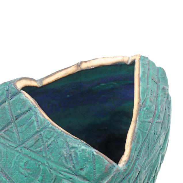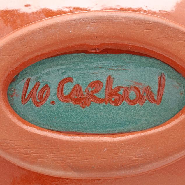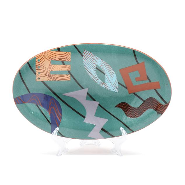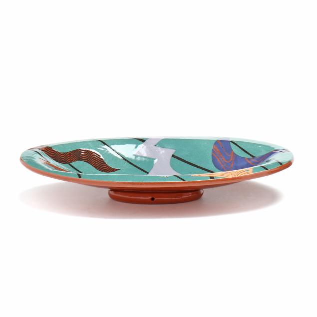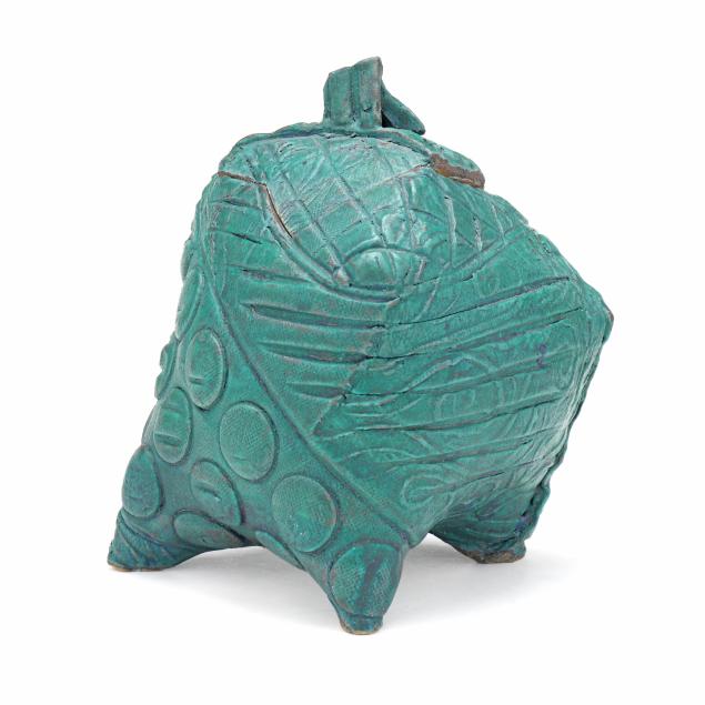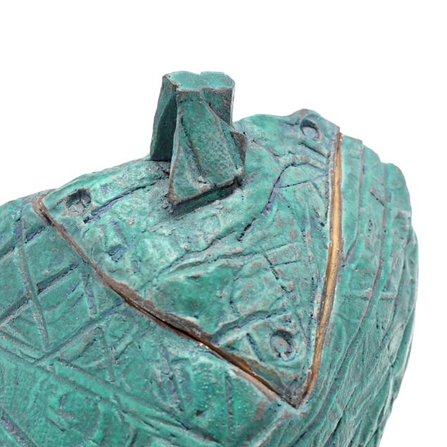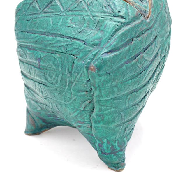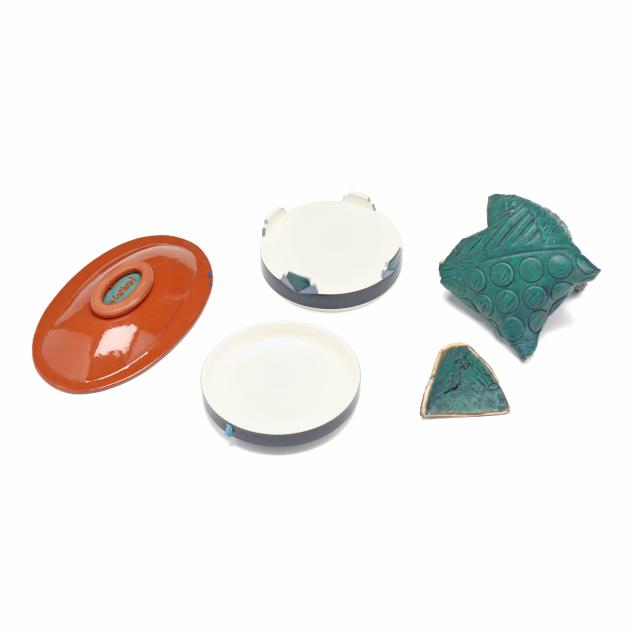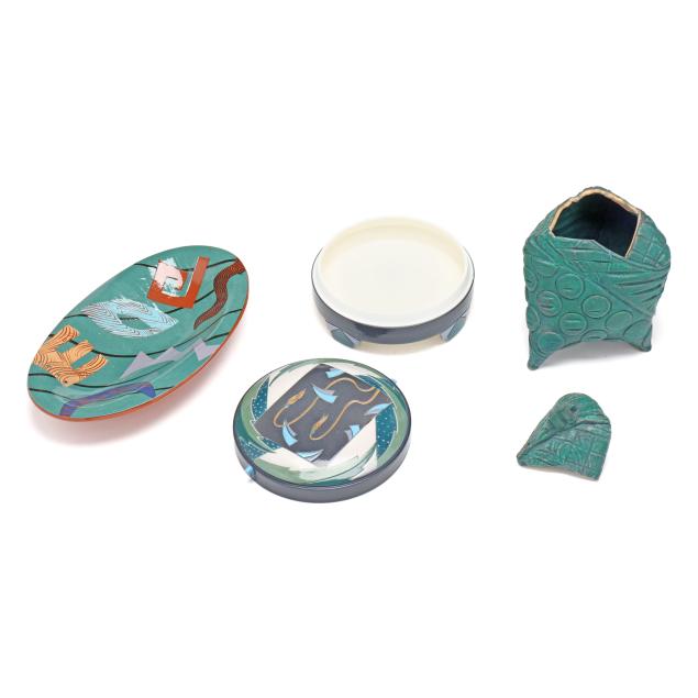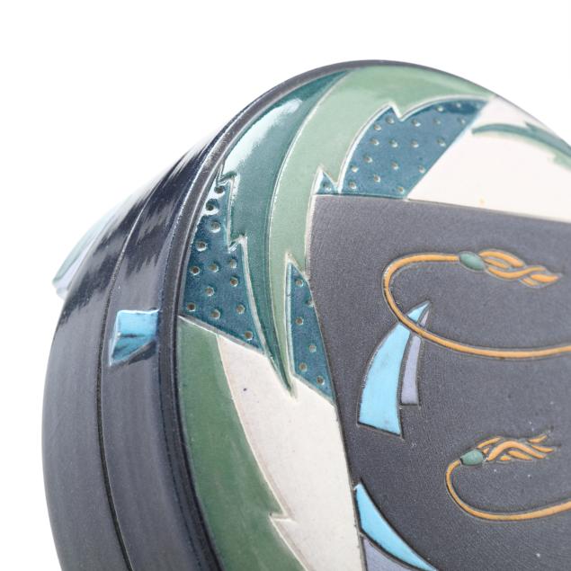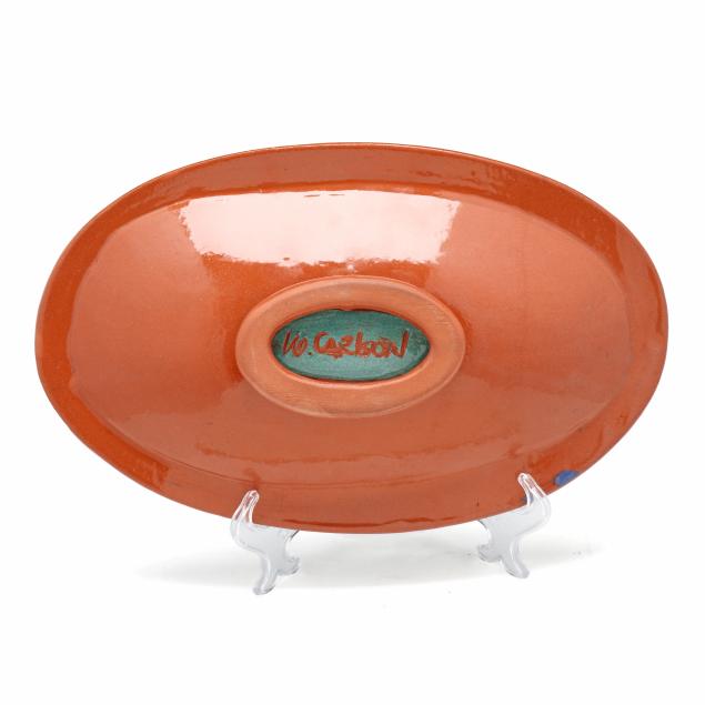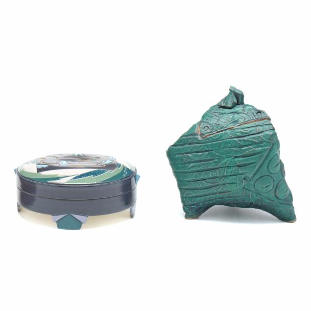 The first a round ceramic box on three feet, with polychrome geometric shape decoration, signed indistinctly to the underside (3 1/4, 7 1/4 in. diameter); the second an oval terracotta dish with teal ground and polychrome patterned geometric shapes to decorate well, signed "W. Carlson" to underside (8 x 7 1/2 x 6 in.); the third a triangular slab built box on three feet, teal glazed with various impressed patterns to whole, unsigned (7 1/8 x 11 1/2 x 2 in.)