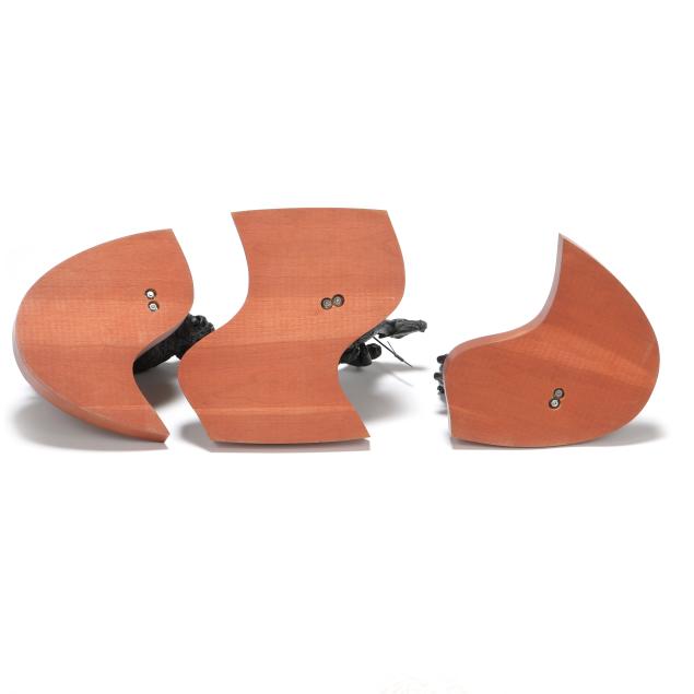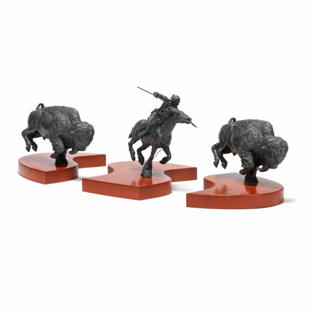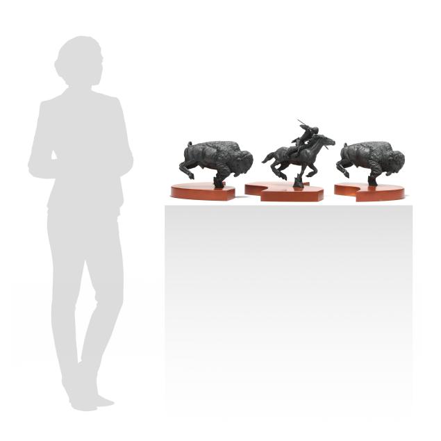 1993, three-part patinated bronze sculpture group, edition numbered "12/35," with signature and date in the casting, each mounted atop conforming custom wooden terrace forming an ellipse. Ken likely made the custom three part work for the client, as the other editions are cast as a two figure composition.