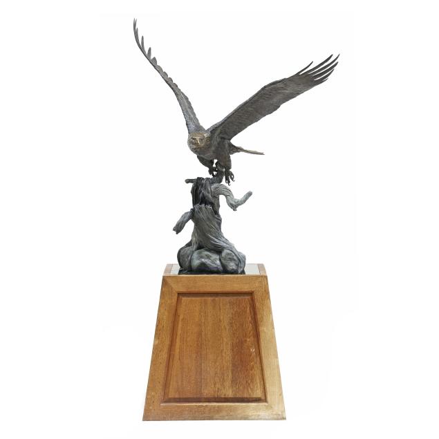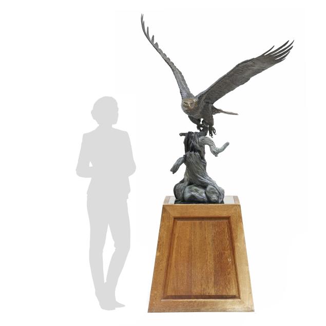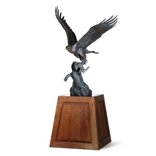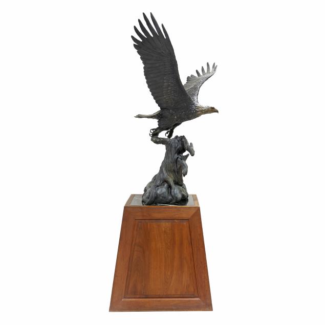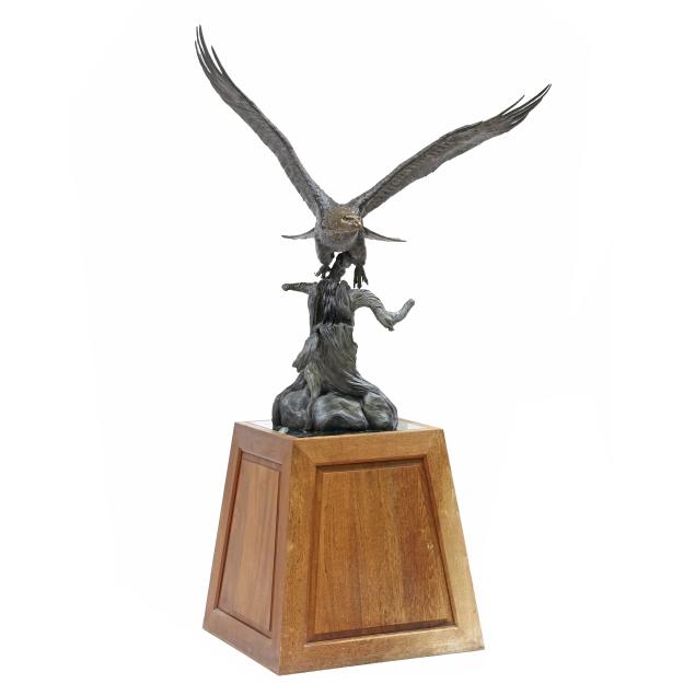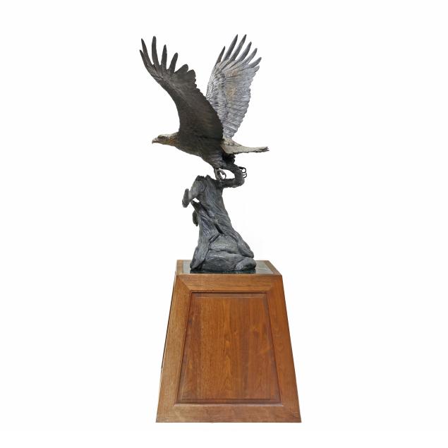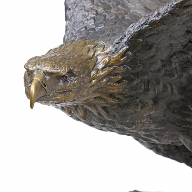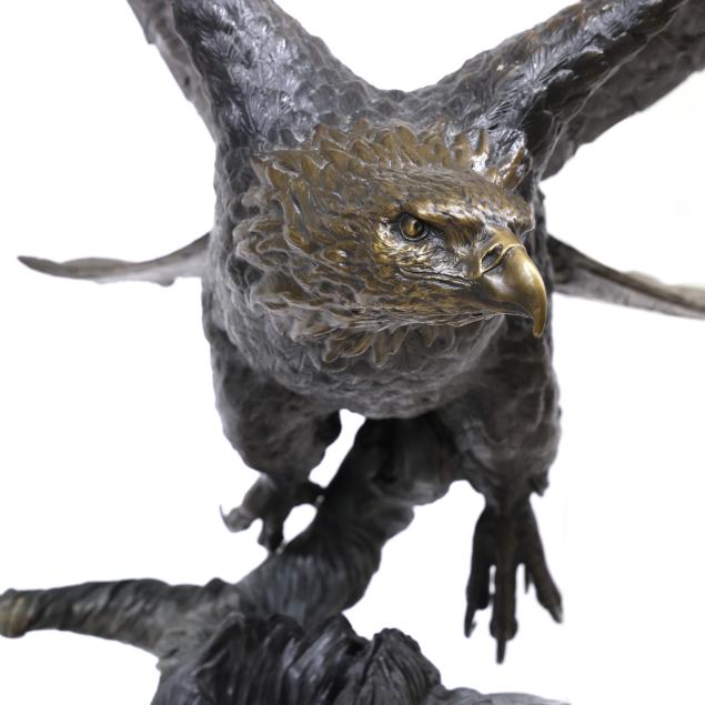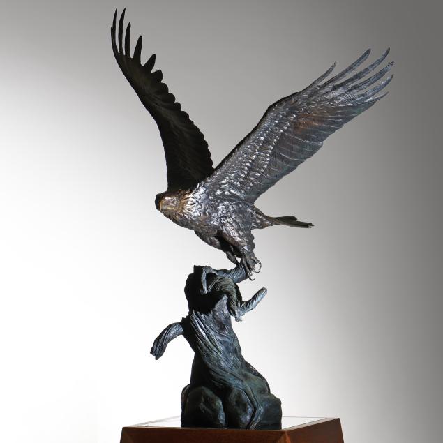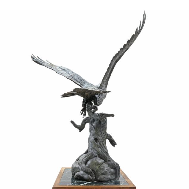 Life-size patinated bronze statue, limited edition numbered "18/35," modeled as a bald eagle taking flight from a weathered stump, together with a custom walnut and green paneled marble plinth.