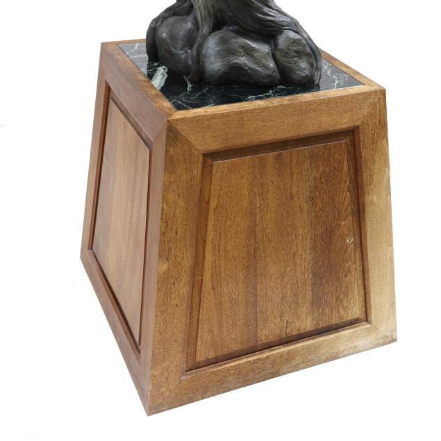 Good estate condition; bronze with areas of light superficial paint specks; plinth with sun-fading and surface marks to wood, lower corner with scuff; one panel is loose for access to underside.