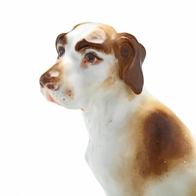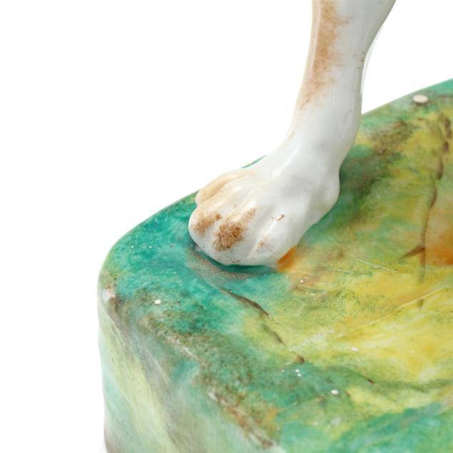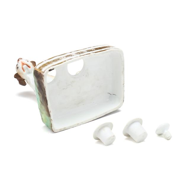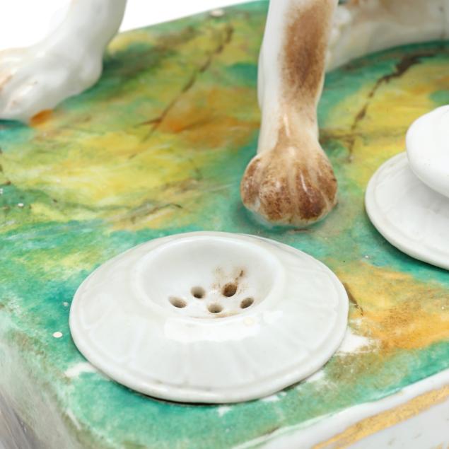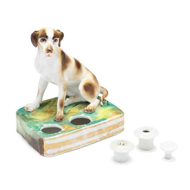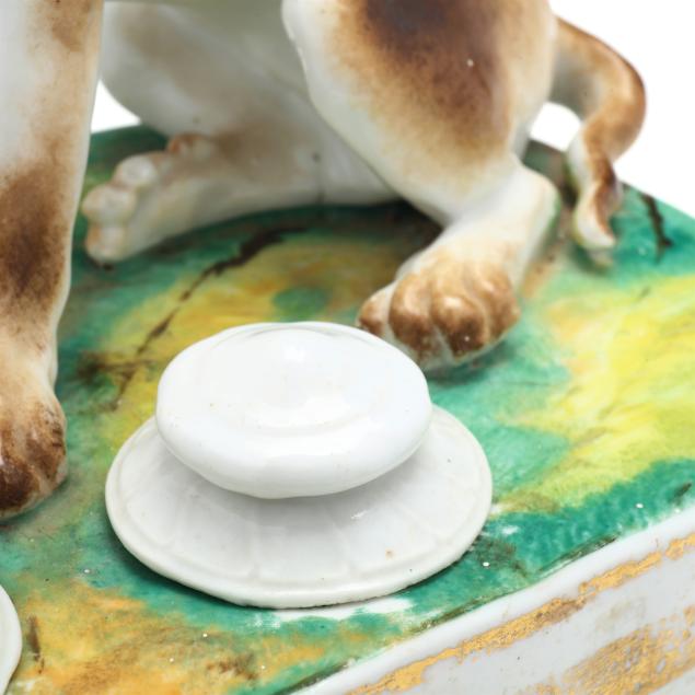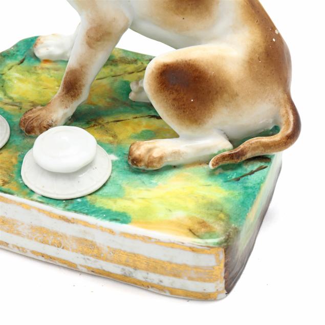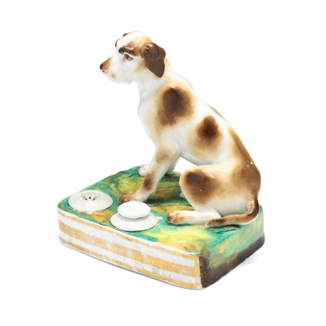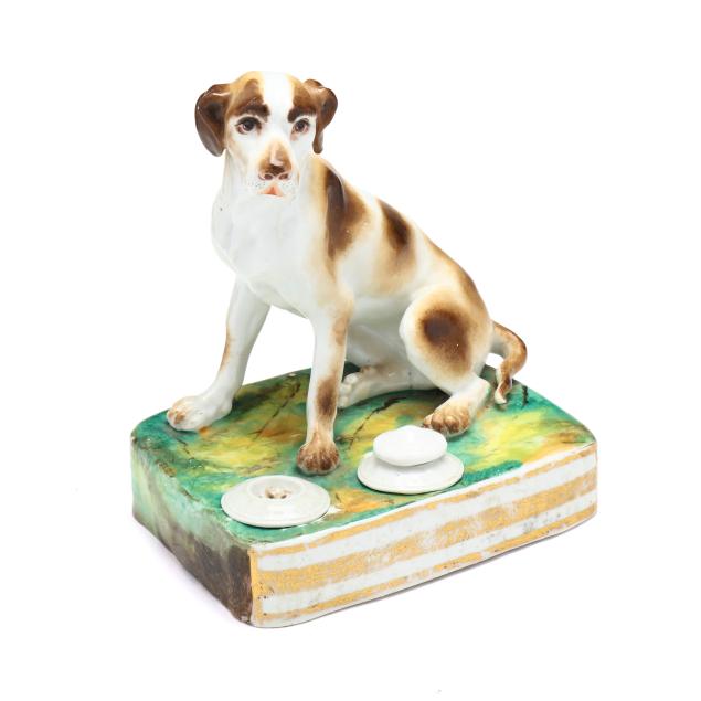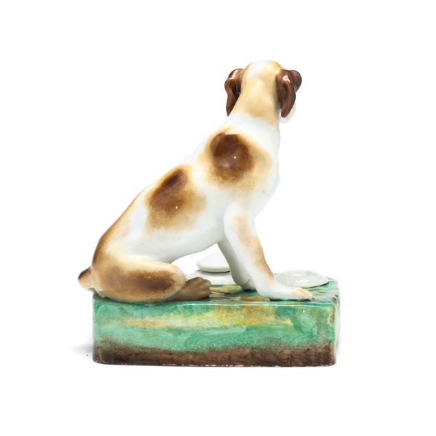 Mid-19th century, likely Paris porcelain or Rockingham, unmarked, painted and gilt porcelain inkwell, in the form of a seated setter or pointer on a rectangular mottled green and yellow terrace with gilt to the obverse, retaining pounce pot and lidded inkwell.