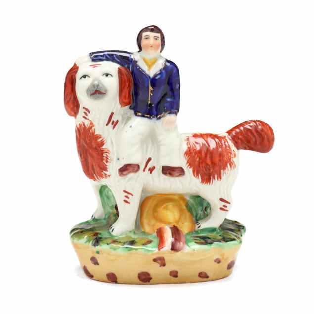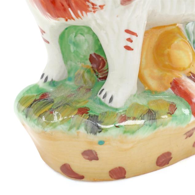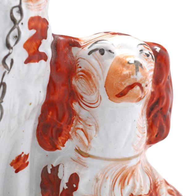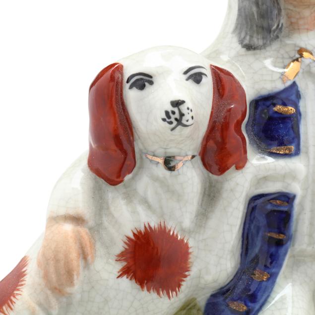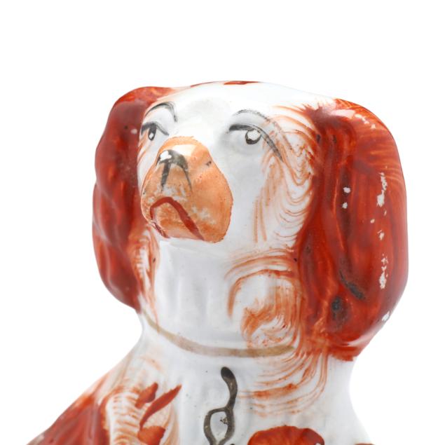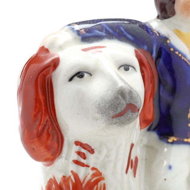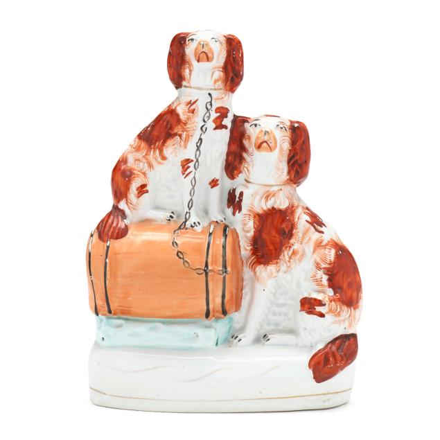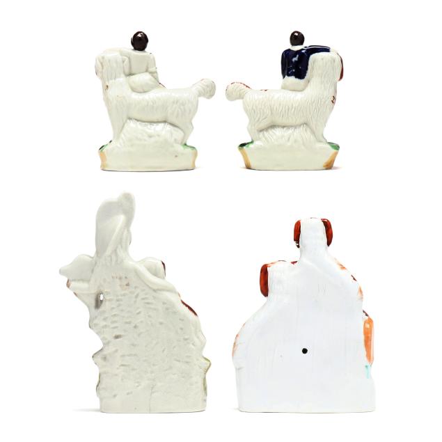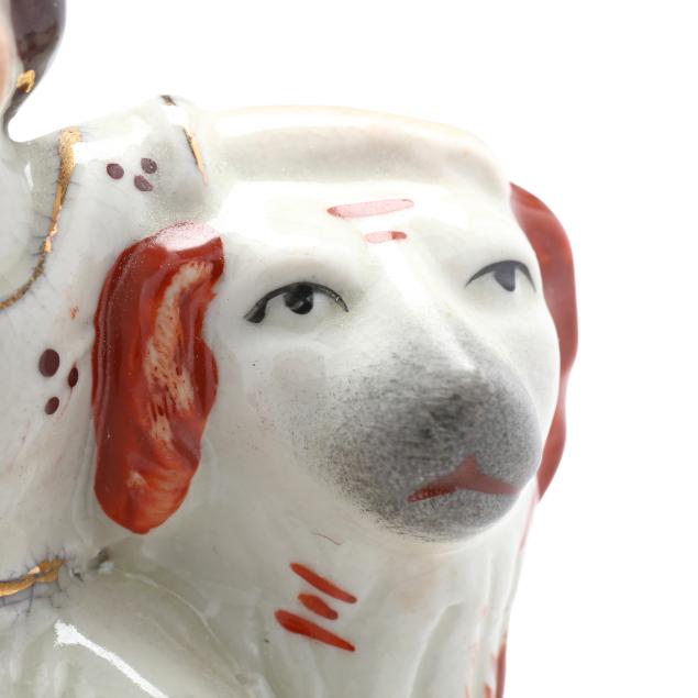 England, second half 19th century, hand-painted and gilt flatback pearlware figures with spaniels, pair of spaniels with red 'X' to underside, otherwise unmarked.