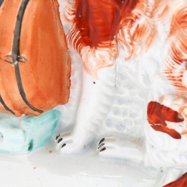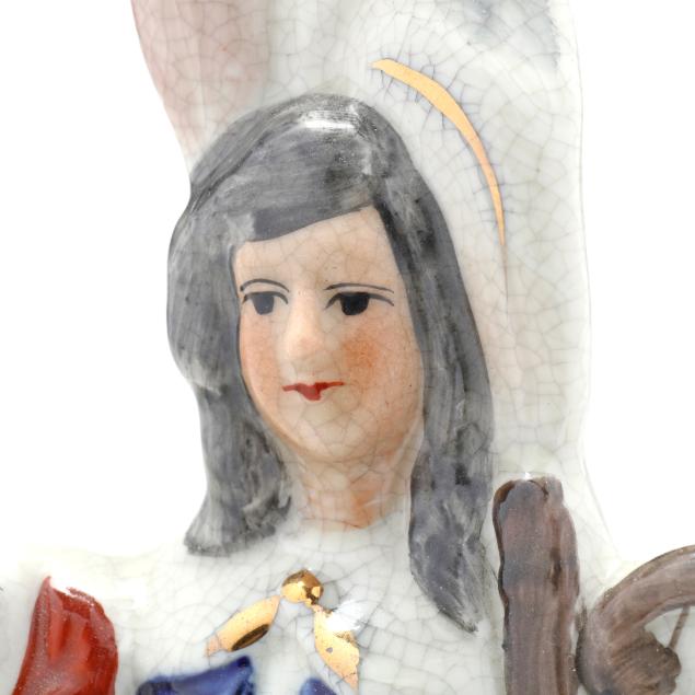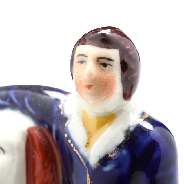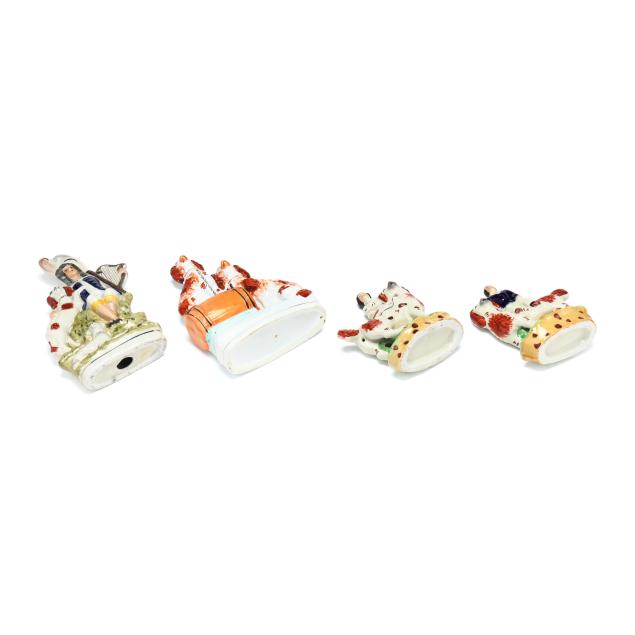 Tallest figure with spaniel and harp (9 3/4 x 6 1/4 x 2 1/2 in.); two spaniels with barrel (8 5/8 x 6 1/2 x 2 1/2 in.); children on spaniels (6 x 4 1/2 x 2 1/2 in. each).