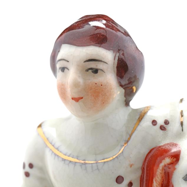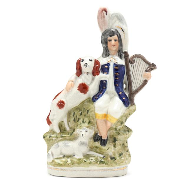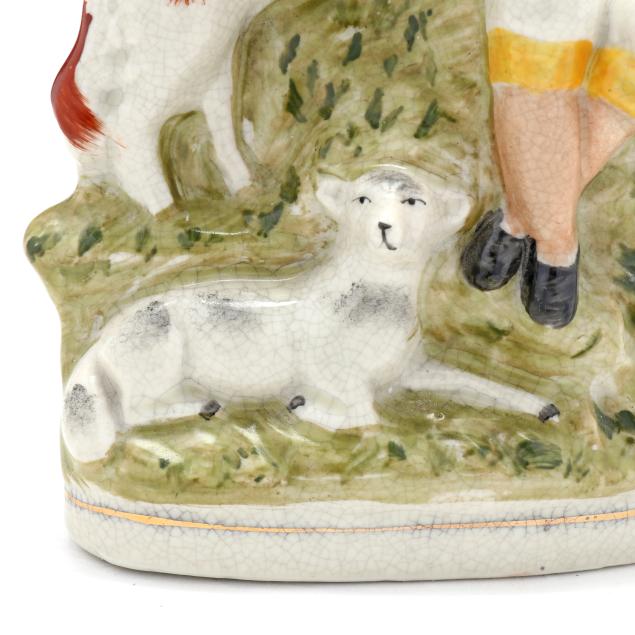 All with crazing; hairline running from base to underside of harp playing shepherd; pair of spaniels with barrel with firing hairlines and a few paint flecks.