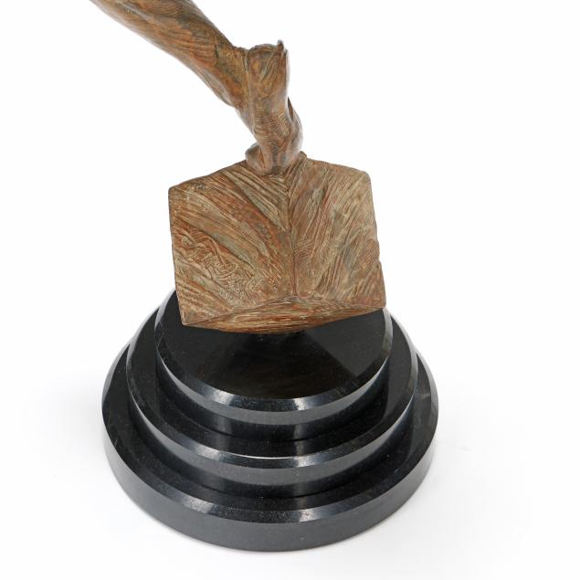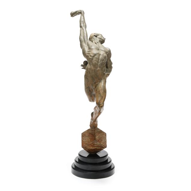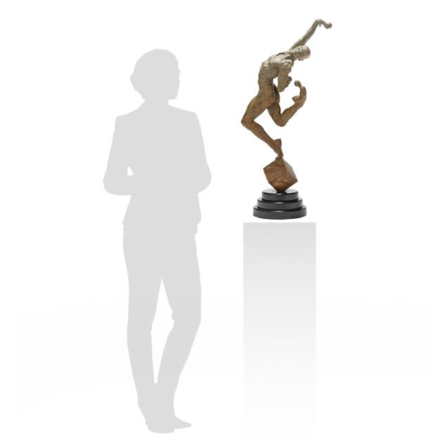 Leap of Faith breaks the bonds of gravity, and seems to twist and spring before our eyes. With a lightness that defies the substance of the bronze, the sculptor has given this figure a powerful athleticism, tempered by grace and wit. The blind-fold reminds us that Viktor's feats take courage and tremendous self-confidence: he is the embodiment of the power of faith in action. Balancing on a cube, we see that his will creates a second by second triumph over gravity --