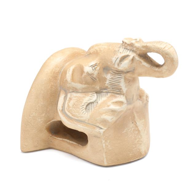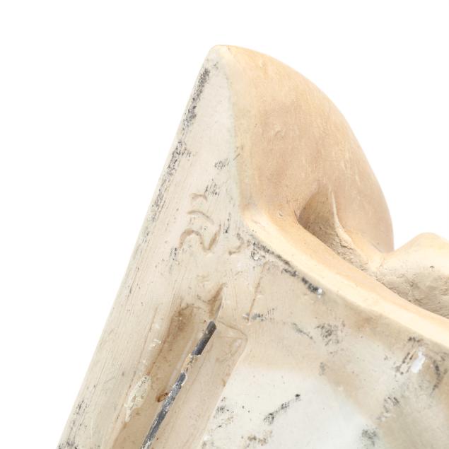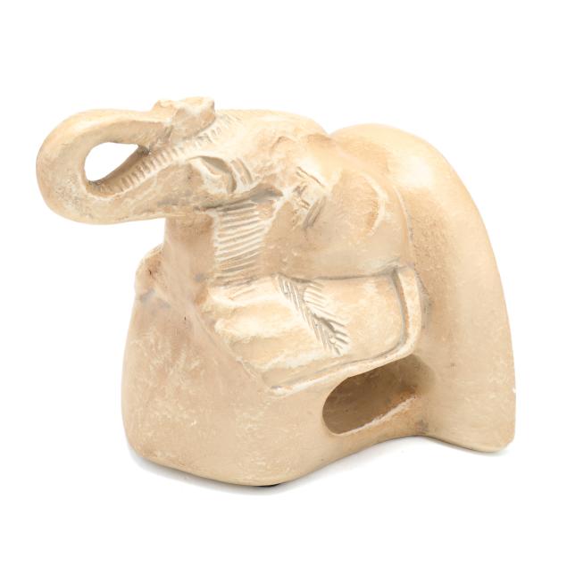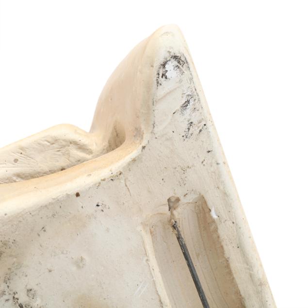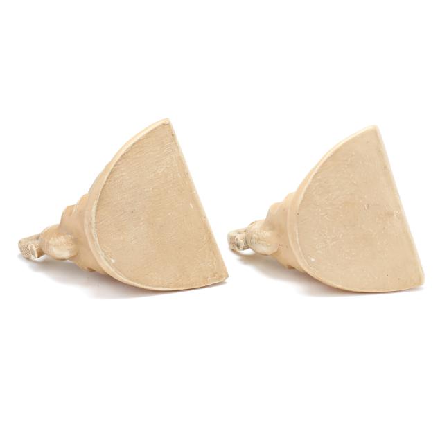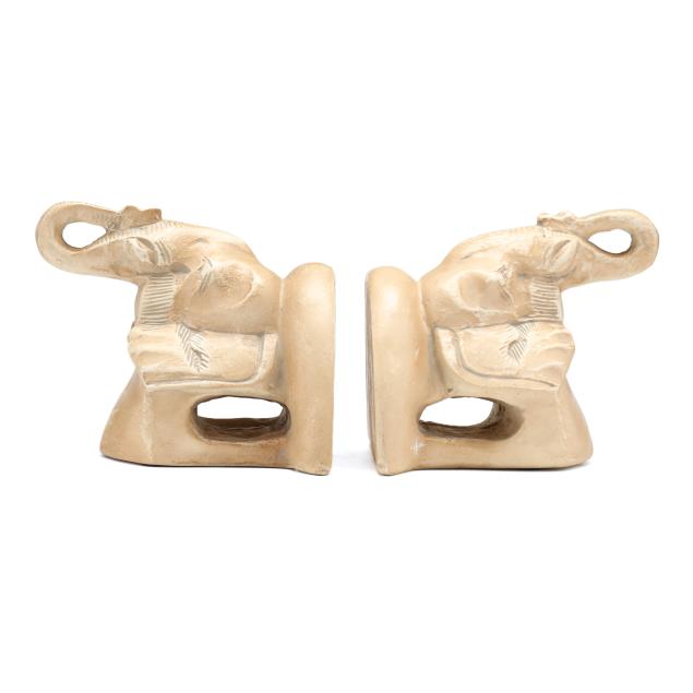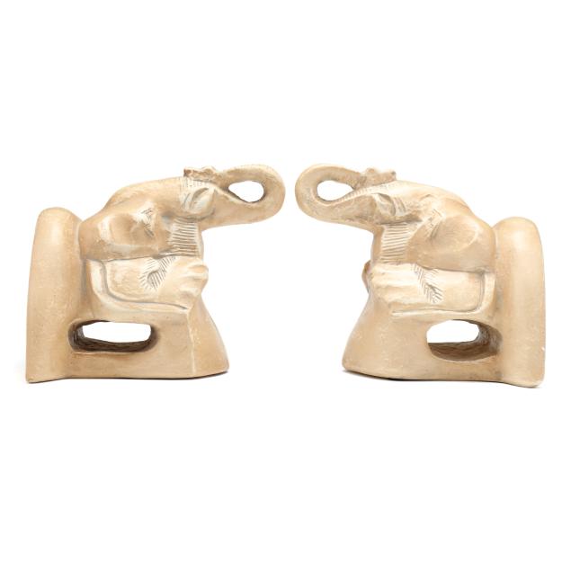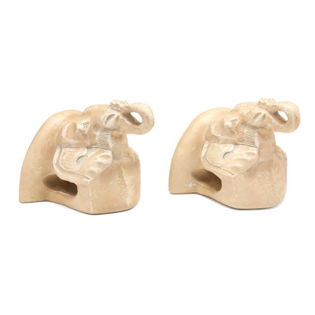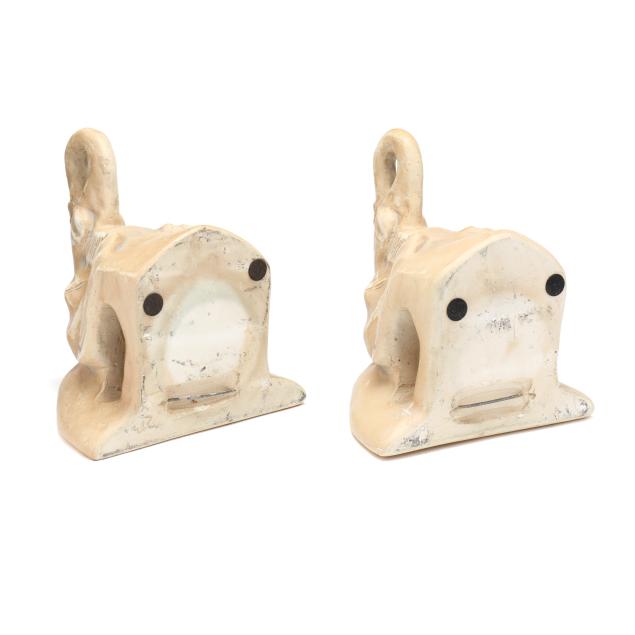 Mid- to late 20th century, plaster with antiqued finish, unmarked, cast in the form of elephant heads with curved trunks, the reverse with integral wires for wall display.