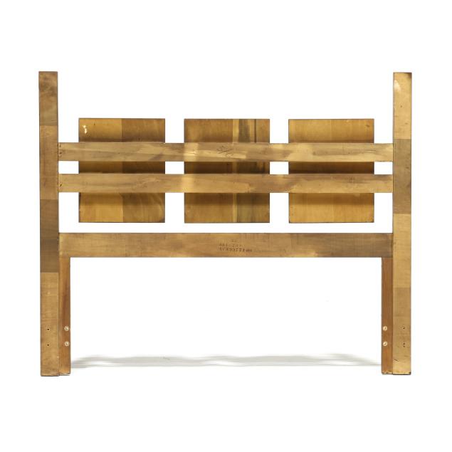 Circa 1970, walnut veneer with patinated brass mounts, model numbers to the back, can fit a full size or be used at full width for a queen size mattress.