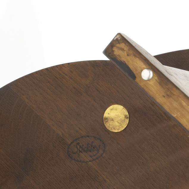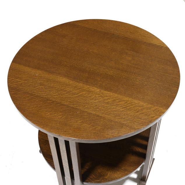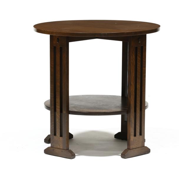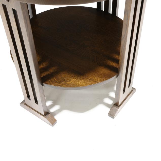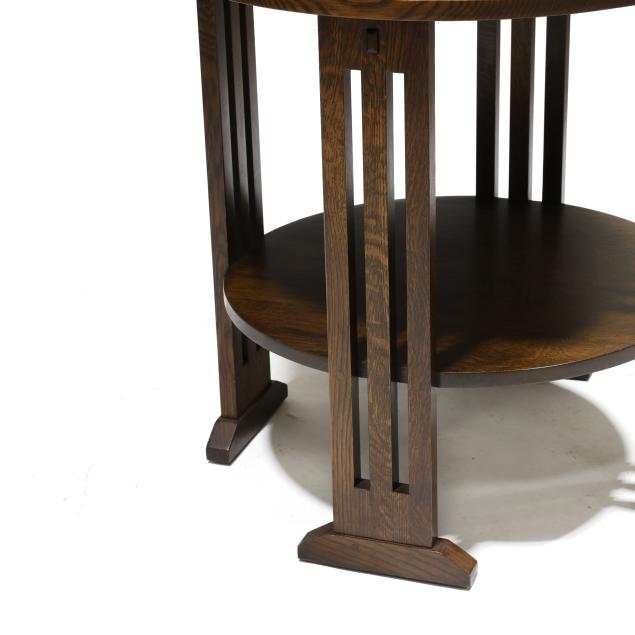 Late 20th century, quarter sawn oak, through tenon joinery, pierced straight legs, lower shelf, stylized shoe feet, labeled.