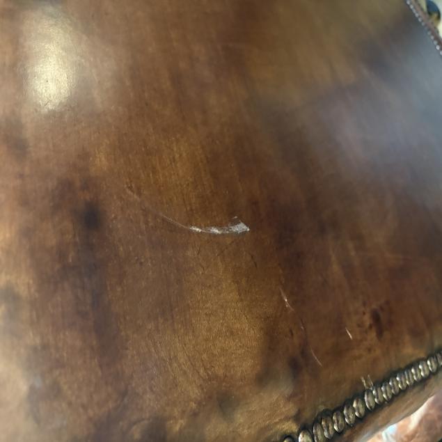 Distressed leather surface with some finish inconsistency and surface cracks; back of the chair with scuff (could likely be stained and buffed to blend).