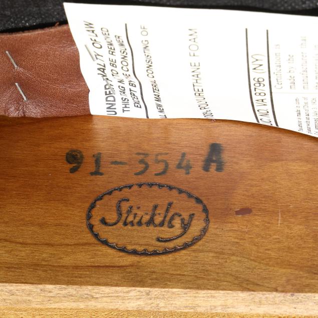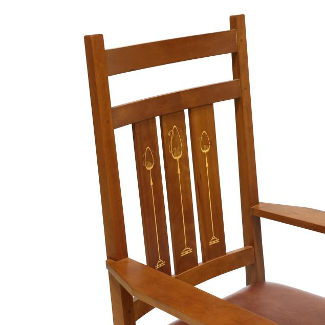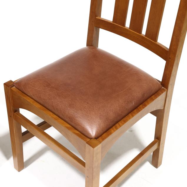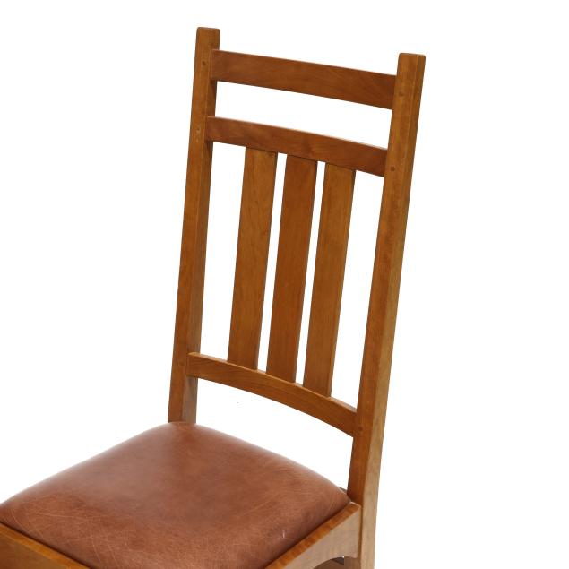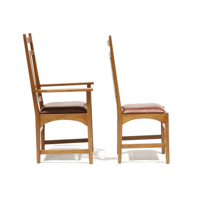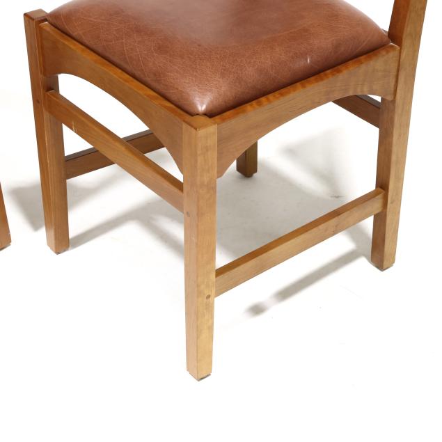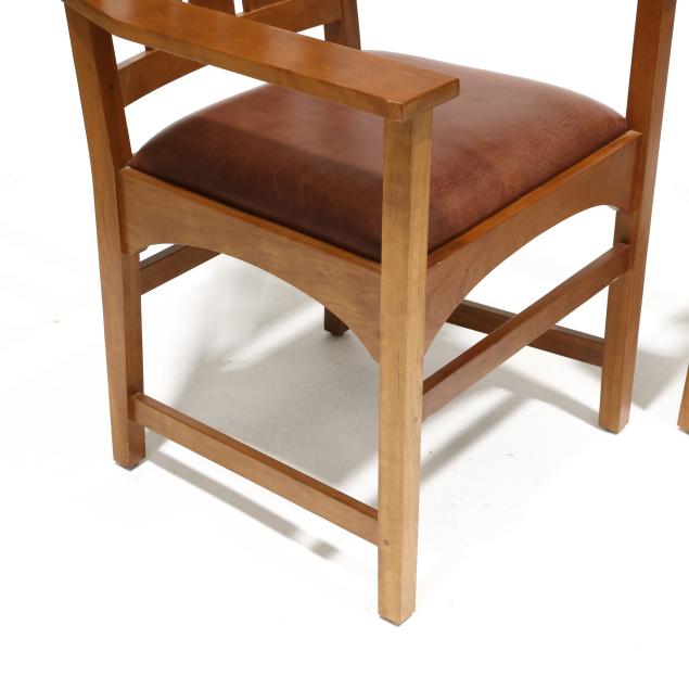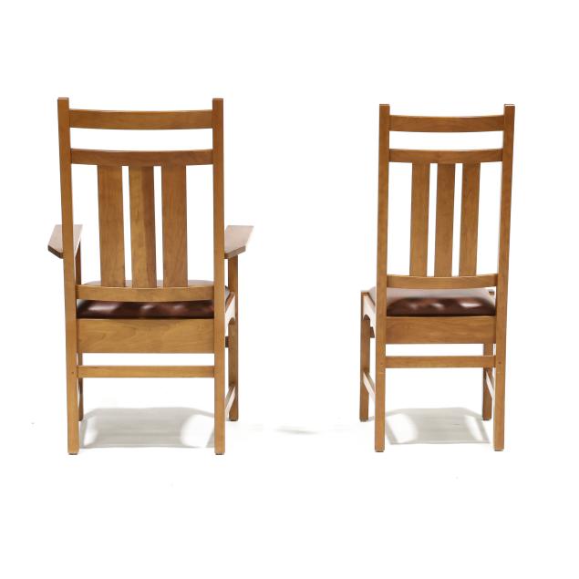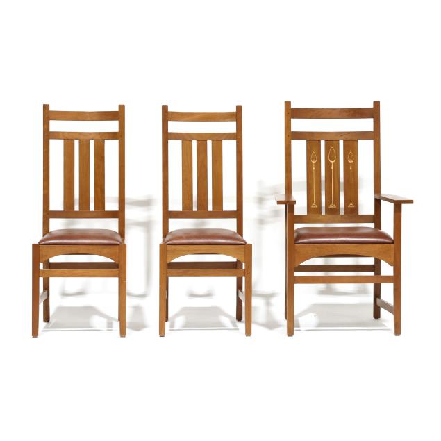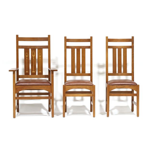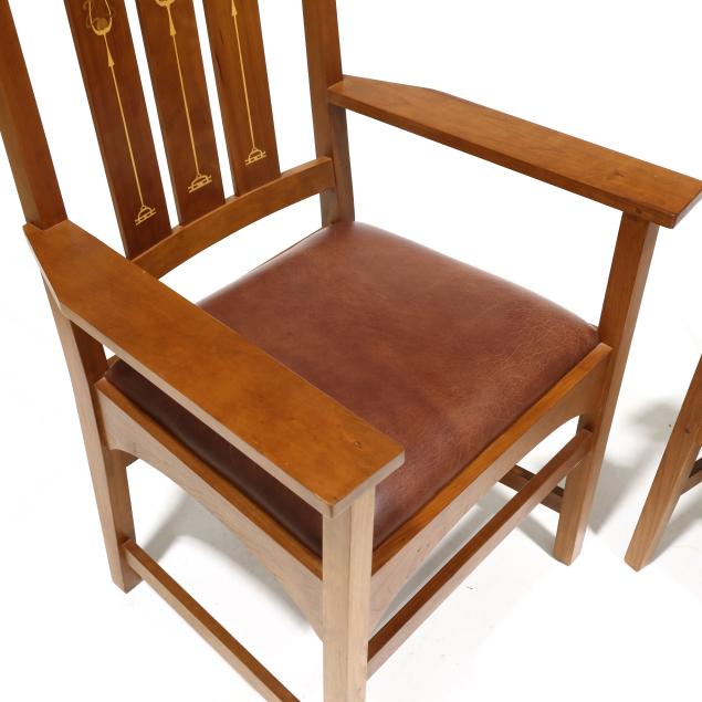 Contemporary, including two armchairs with Harvey Ellis style art nouveau inlays and four side chairs with brown leather upholstered slip seats, labeled.