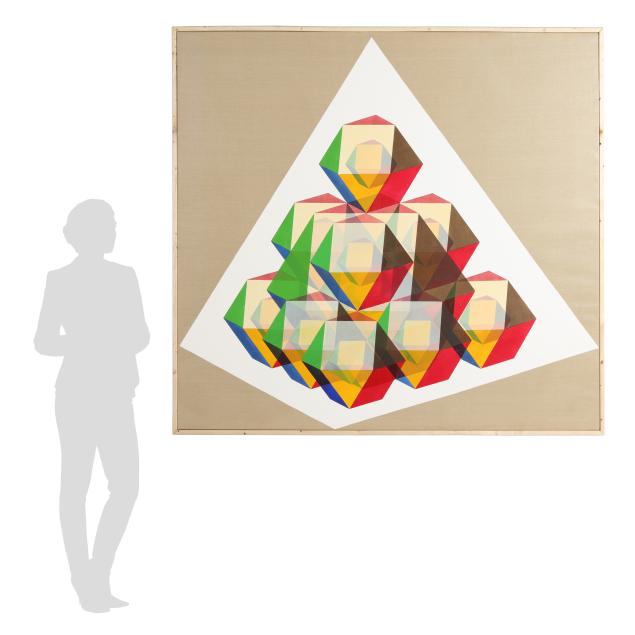 Hiigli's transfixing geometric paintings synthesize the teachings of Jean Piaget and Richard Buckminster Fuller. He endeavors "to create certain images of totality, images that are optical and energetic—not a 'signal' or transmitter, or point of reception of 'something else'—but objects, states of mind, visions that stand for what they are in and of themselves."