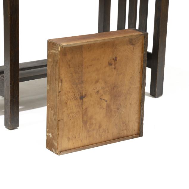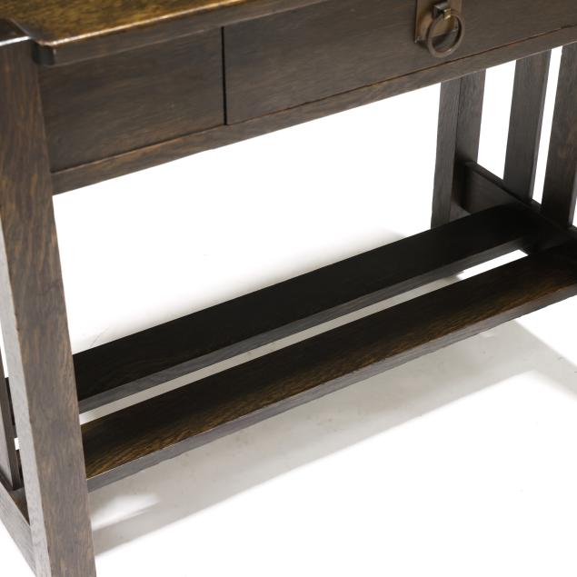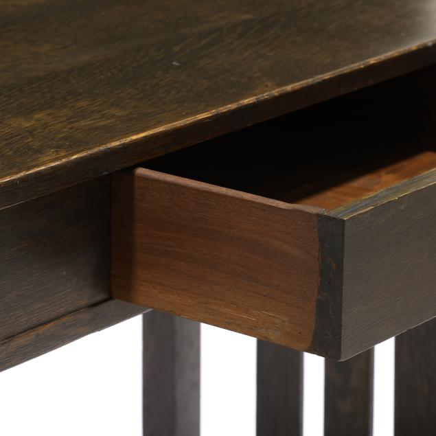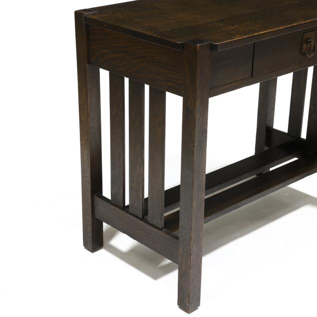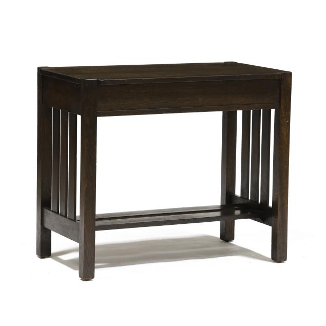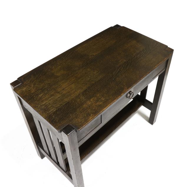 Early 20th century, rectangular top with cut corners, single drawer with ring pull, straight legs, slat sides and double slat stretcher base, underside with model number stencil, otherwise, appears unmarked.