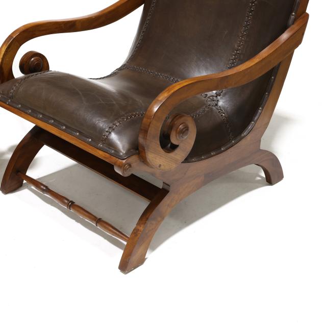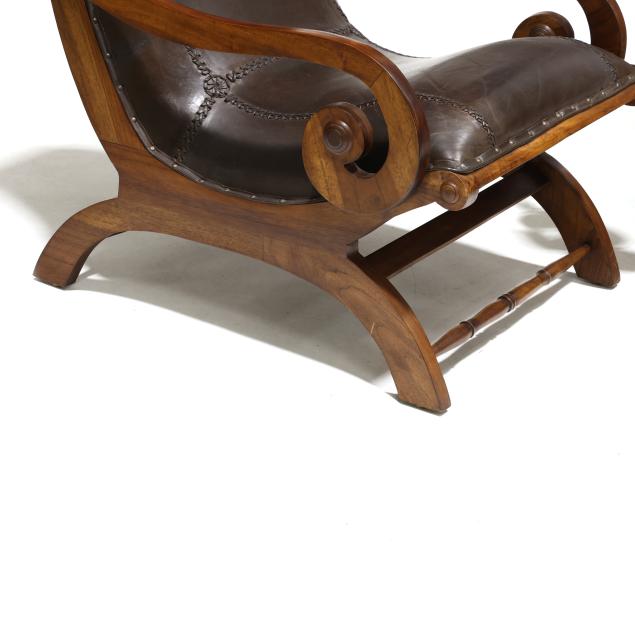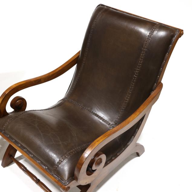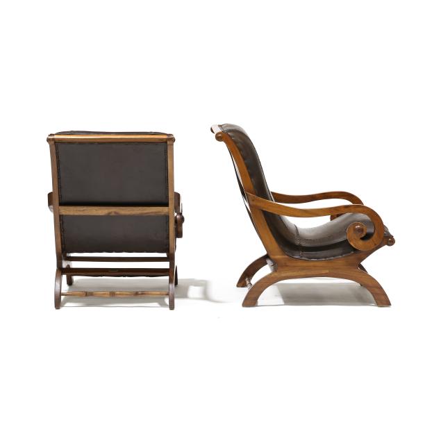 Late 20th century, mahogany frames, stitched brown leather upholstery with nail head trim, scrolled arms, turned stretchers, labeled.