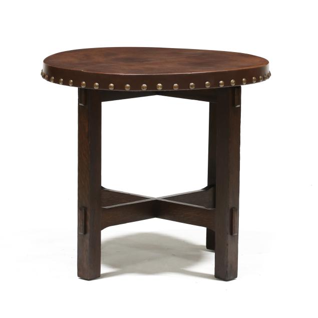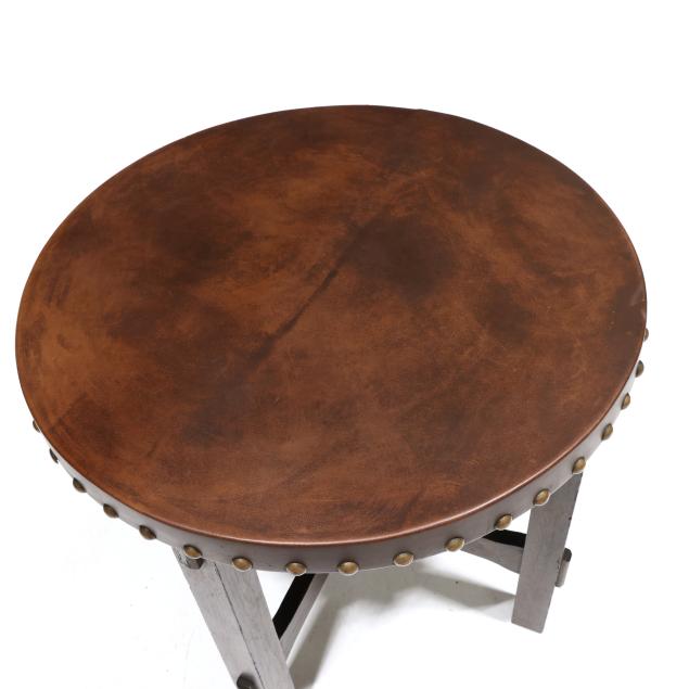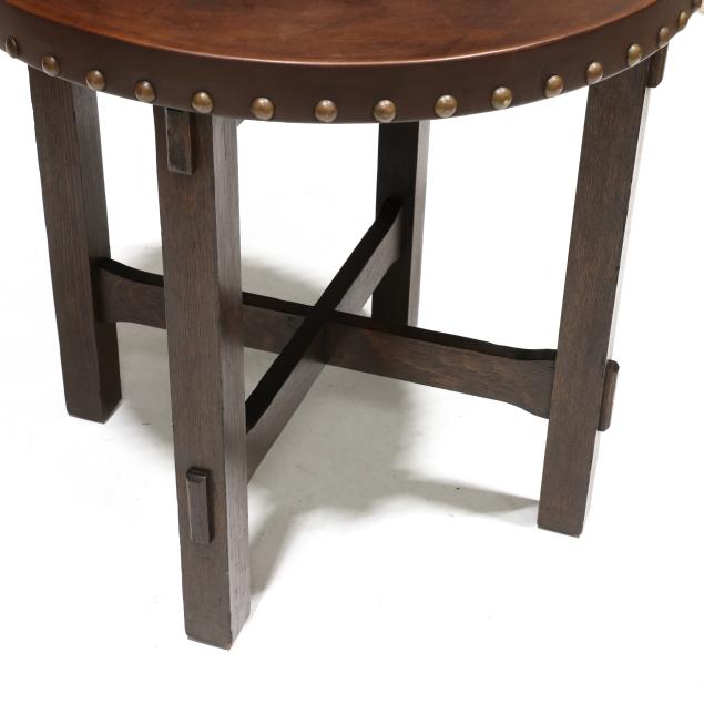 Early 20th century, brown leather wrapped top with brass tack edge, four straight legs with through tenon cross stretcher base, the underside with illegible label.