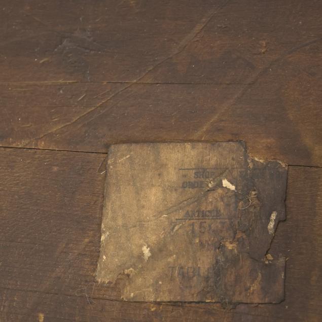 Later leather; loss and staining to underside label; some nicks to the edges of the legs; slight warp to top.