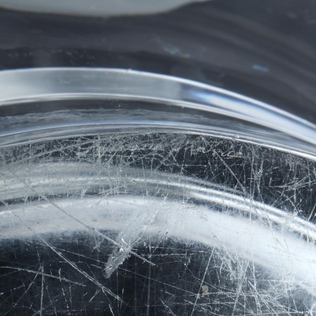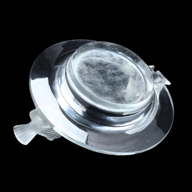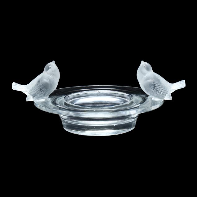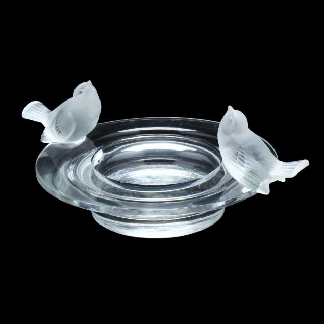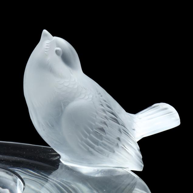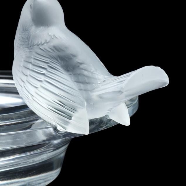 France, mid-20th century, clear molded crystal with satin finished sparrows resting on a wide rimmed bowl, signed to underside.