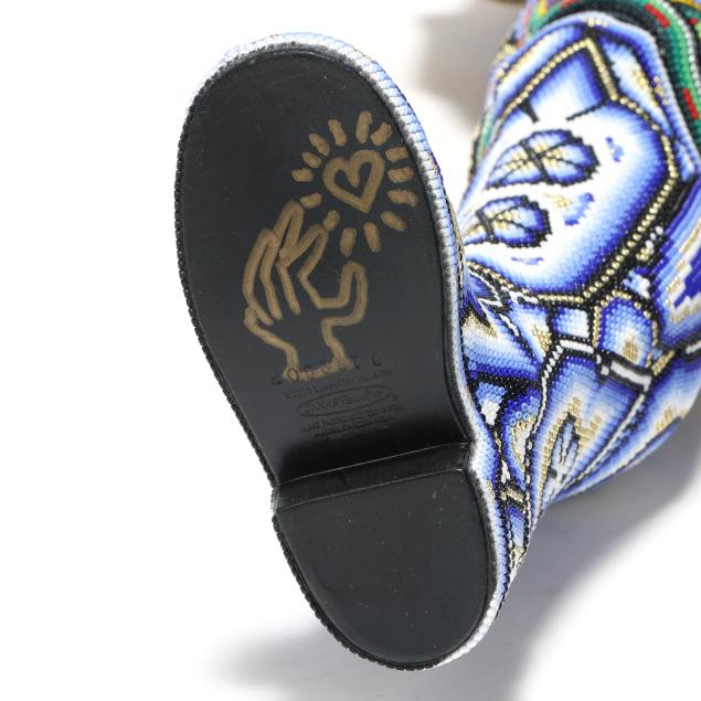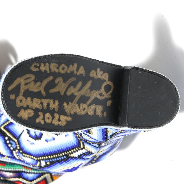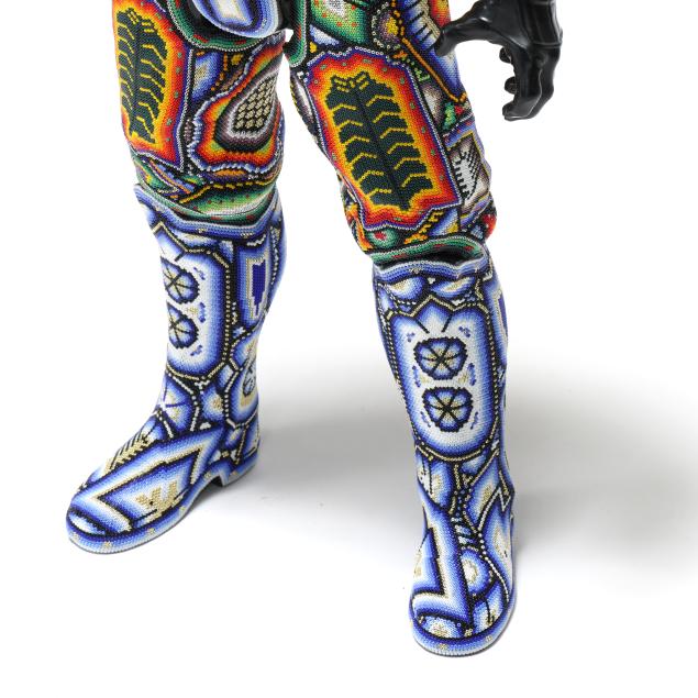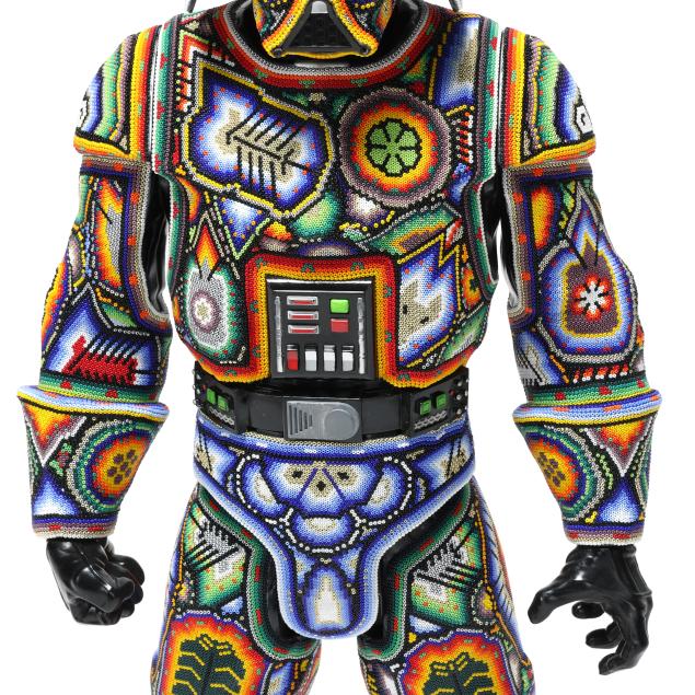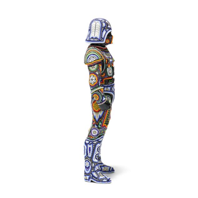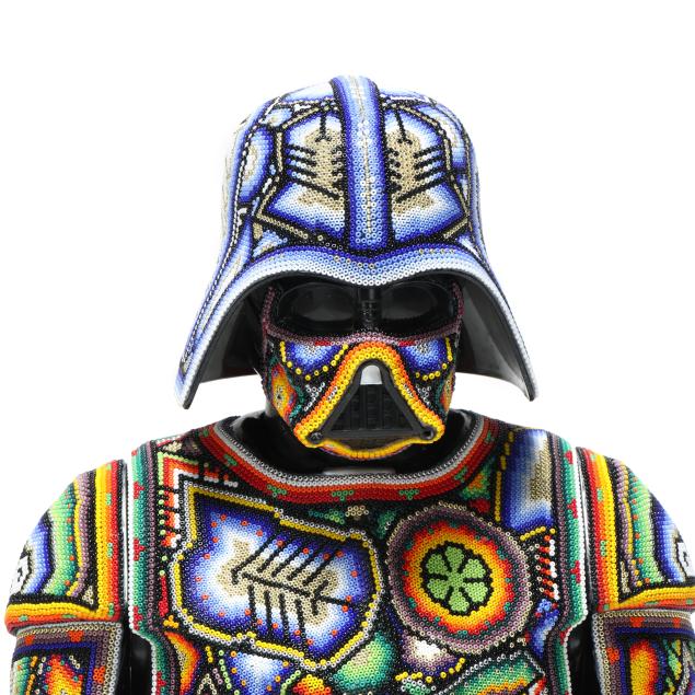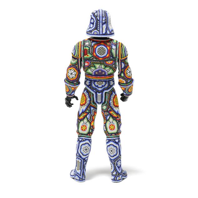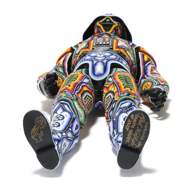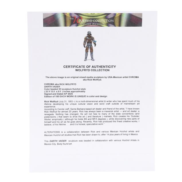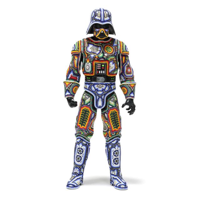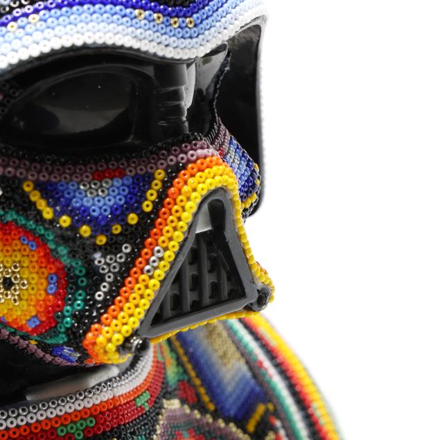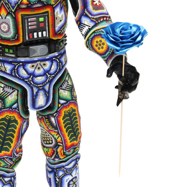 2025, Artist Proof from and edition of 100, ink signed, numbered "AP" and dated to the underside, Huichol style color beaded 3D sculpture, uniquely colored and designed in collaboration with various Huichol artists in Mexico city, Darth in standing pose offering a blue silk flower. Included with the Lot is a signed certificate of authenticity by the artist.