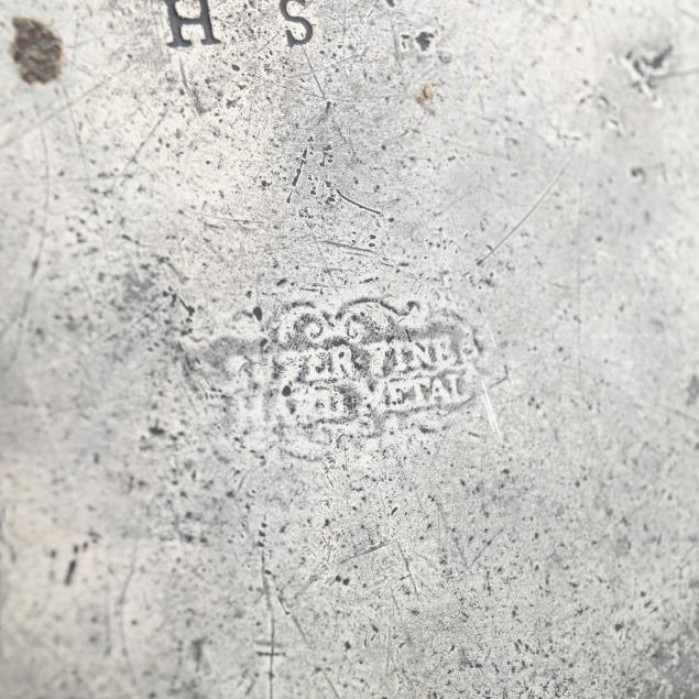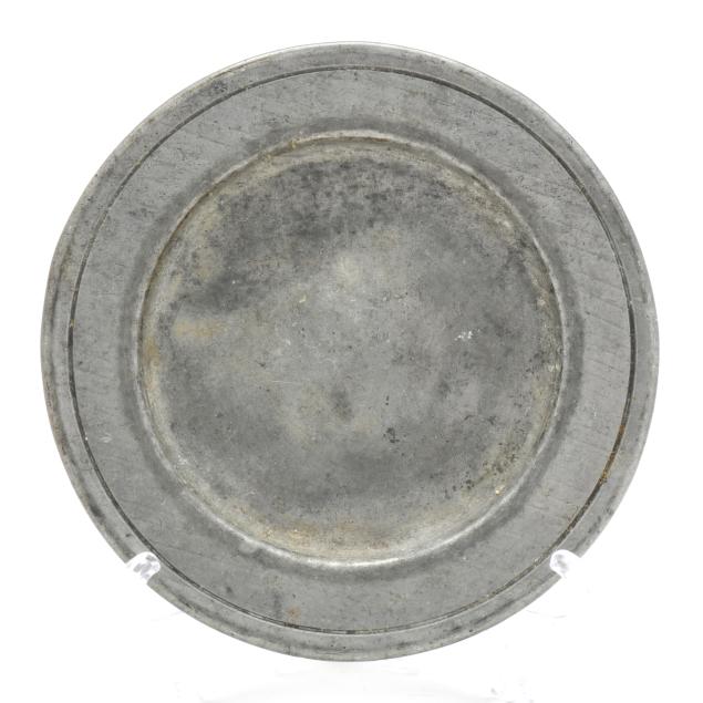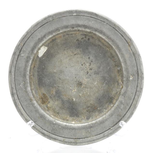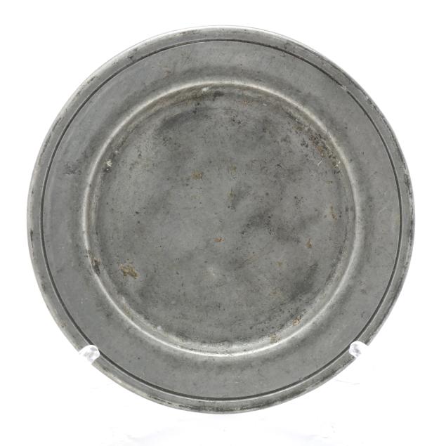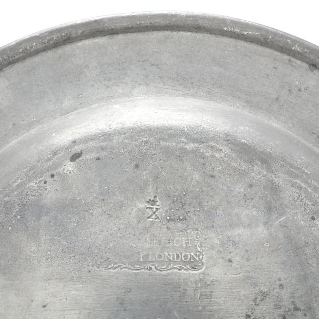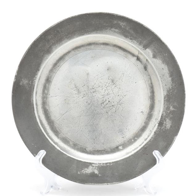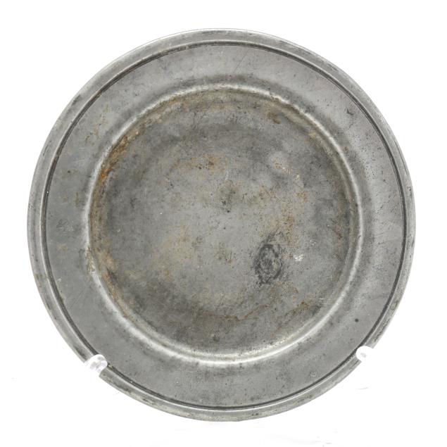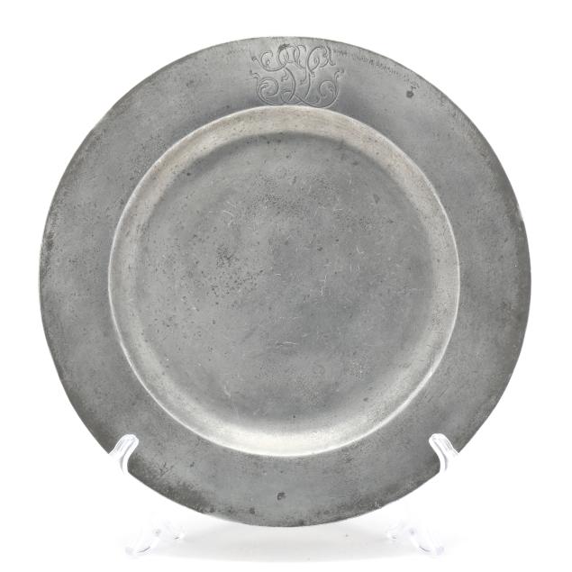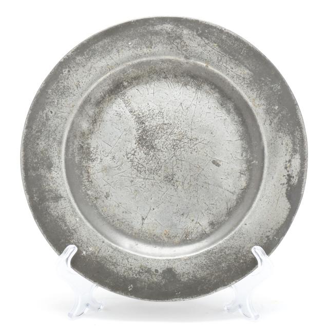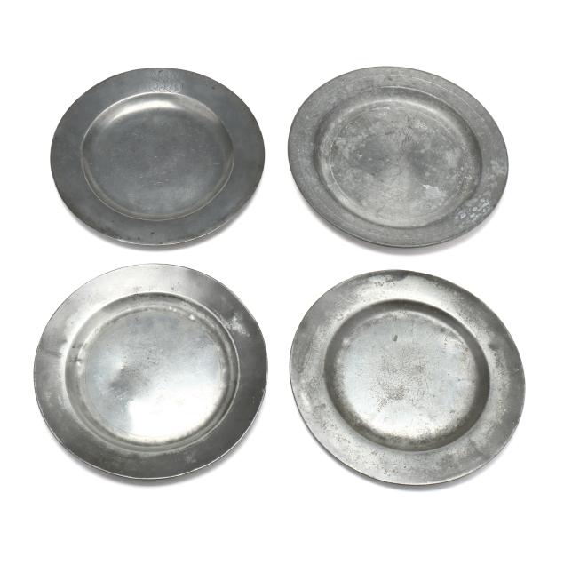 (9) pieces to include (8) mid- to late 18th century plates: (4) miniature plates, impressed "LONDON" and with Christie's label to underside (4 3/8 in.); (1) plate with monogram to rim touch marks of Townsend and Compton and Thomas Giffin (working 1760-1777) to underside (9 3/4 in.); (1) plate stamped "ER" and "LONDON" with touch marks and quality mark to underside (9 5/8 in.); (1) plate stamped "HSS" and "Super Fine / Hard Metal" with touch mark and quality mark to underside (9 5/8 in.); and a Colonial Casting Company colonial revival plate, marked to underside (10 in.).