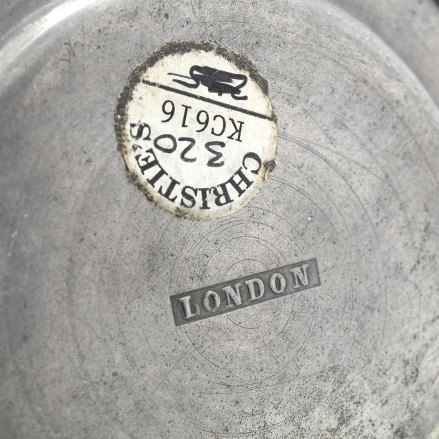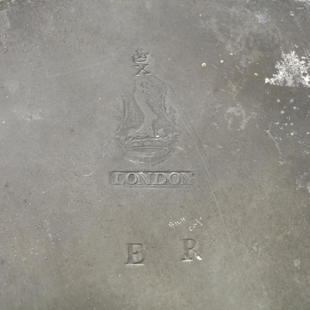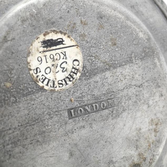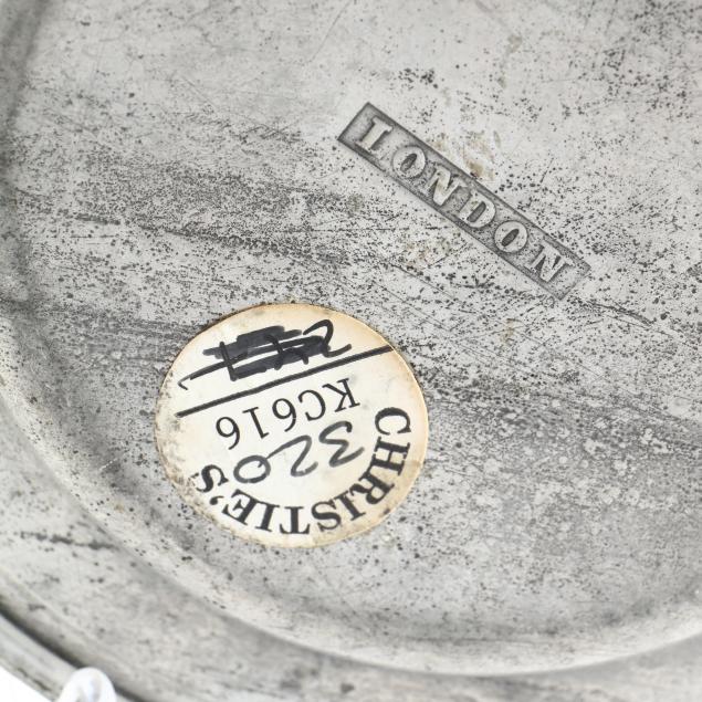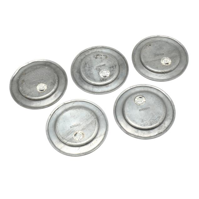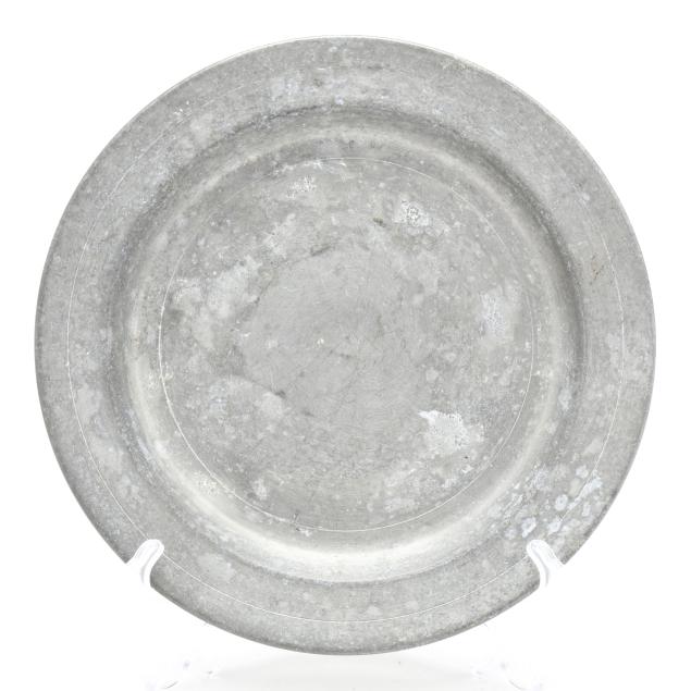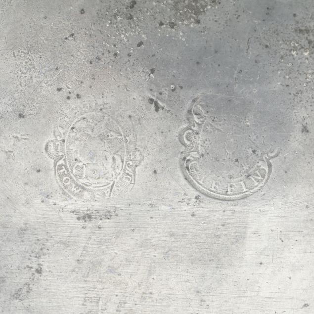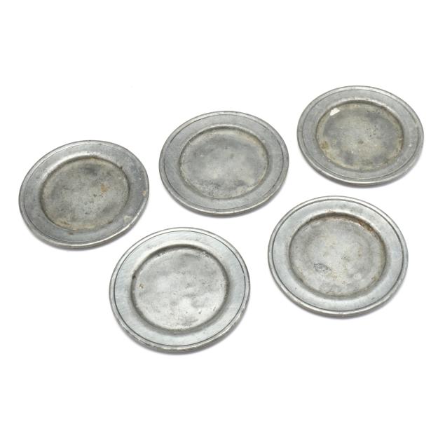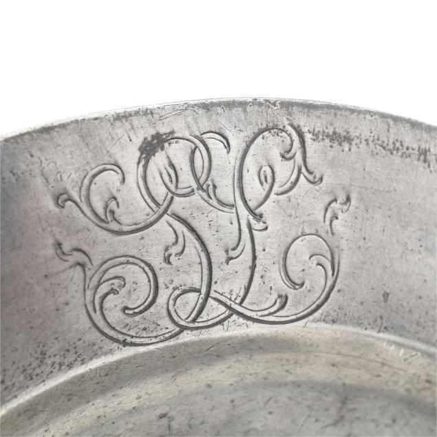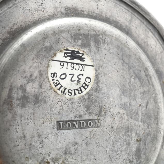 (9) pieces to include (8) mid- to late 18th century plates: (4) miniature plates, impressed "LONDON" and with Christie's label to underside (4 3/8 in.); (1) plate with monogram to rim touch marks of Townsend and Compton and Thomas Giffin (working 1760-1777) to underside (9 3/4 in.); (1) plate stamped "ER" and "LONDON" with touch marks and quality mark to underside (9 5/8 in.); (1) plate stamped "HSS" and "Super Fine / Hard Metal" with touch mark and quality mark to underside (9 5/8 in.); and a Colonial Casting Company colonial revival plate, marked to underside (10 in.).