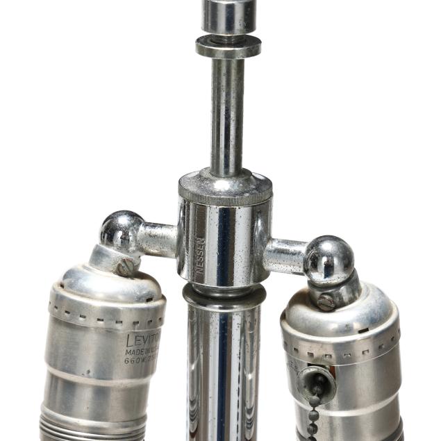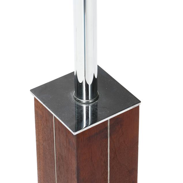 Bronx, New York, circa 1965, walnut and metal, dual socket tower form together with a rectangular linen shade, retaining vintage company label to the underside.