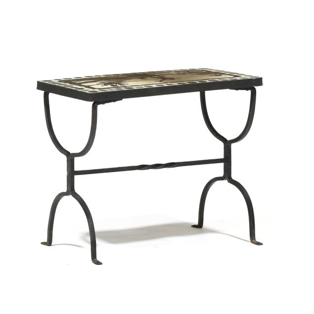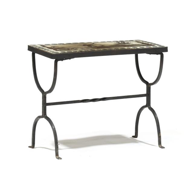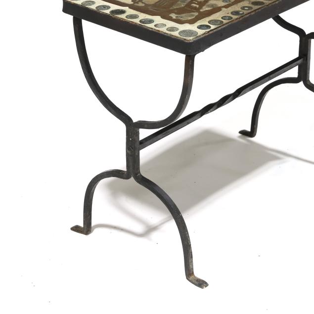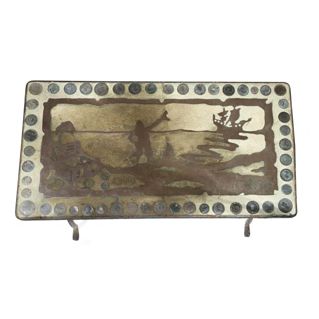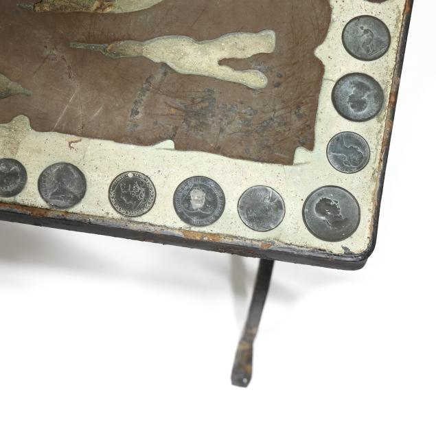 Mid-20th century, black painted iron frame, cast stone top with bronze inlaid silhouette of Black Beard and his ship with treasure chest, the border with Continental antique coins.