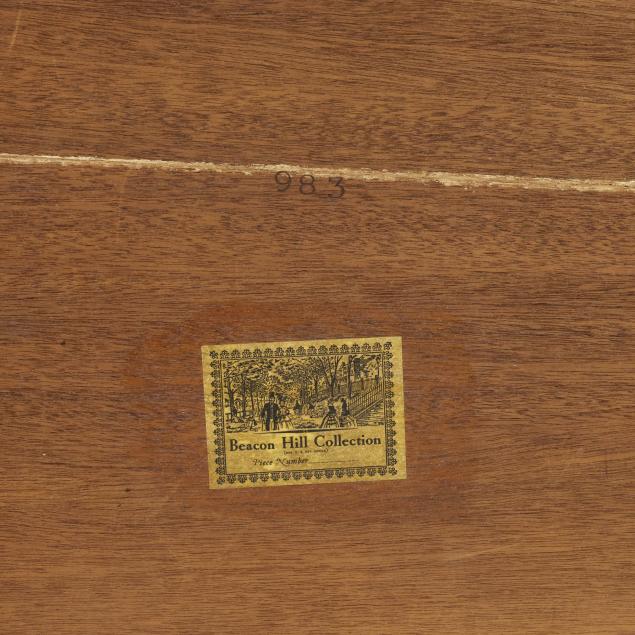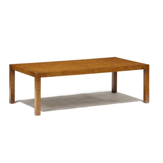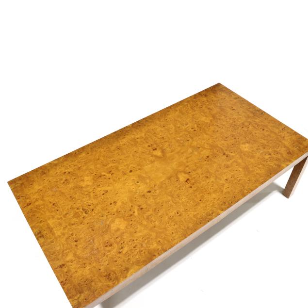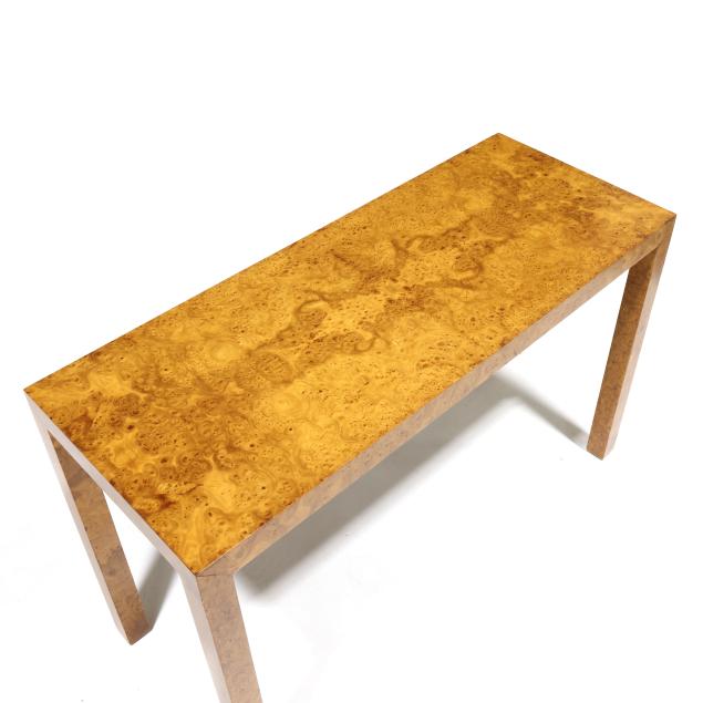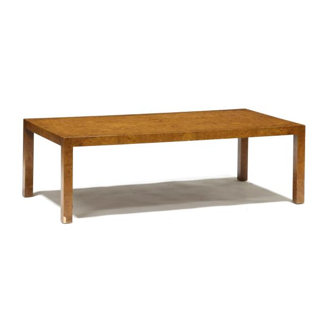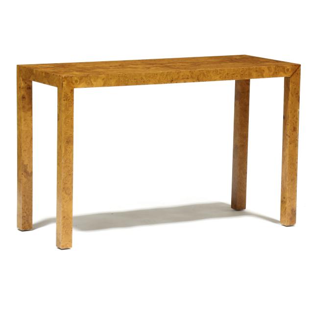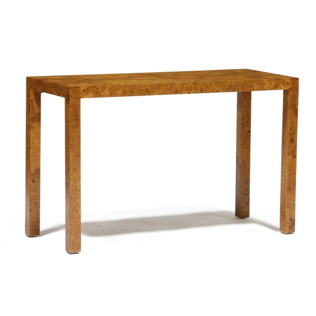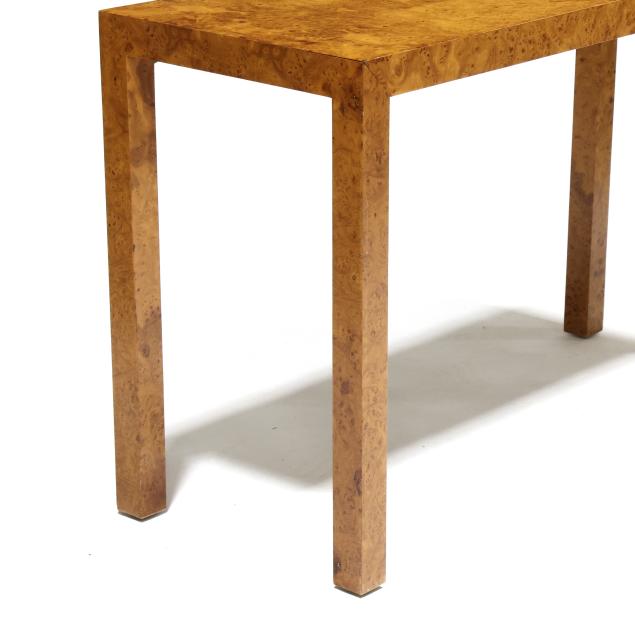 Second half 20th century, high grade burl wood veneers with book-matched tops, straight legs, finished on all sides, labeled.