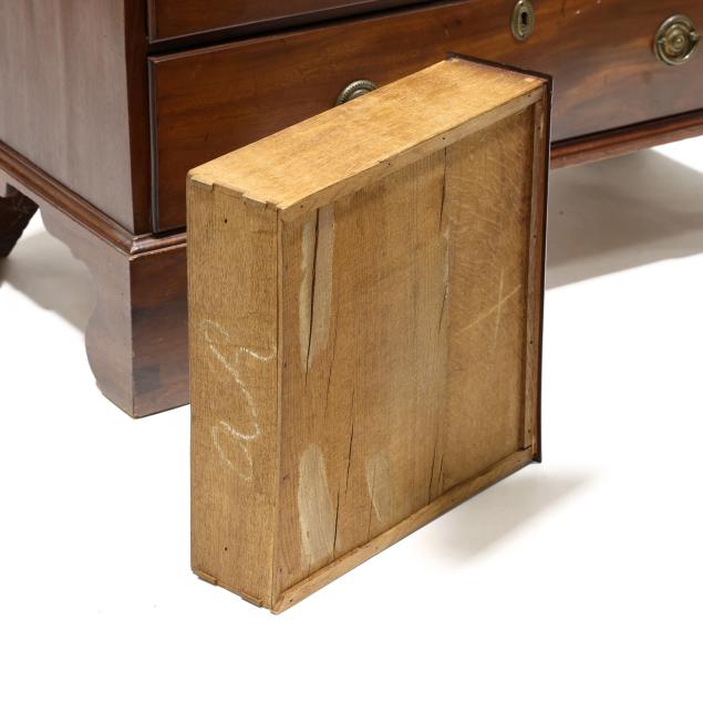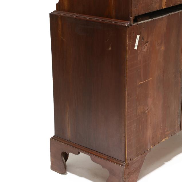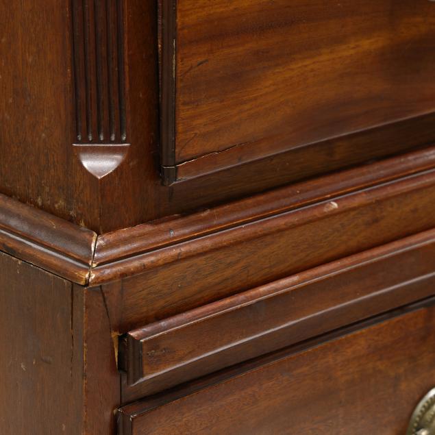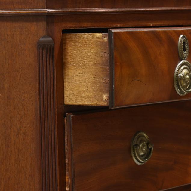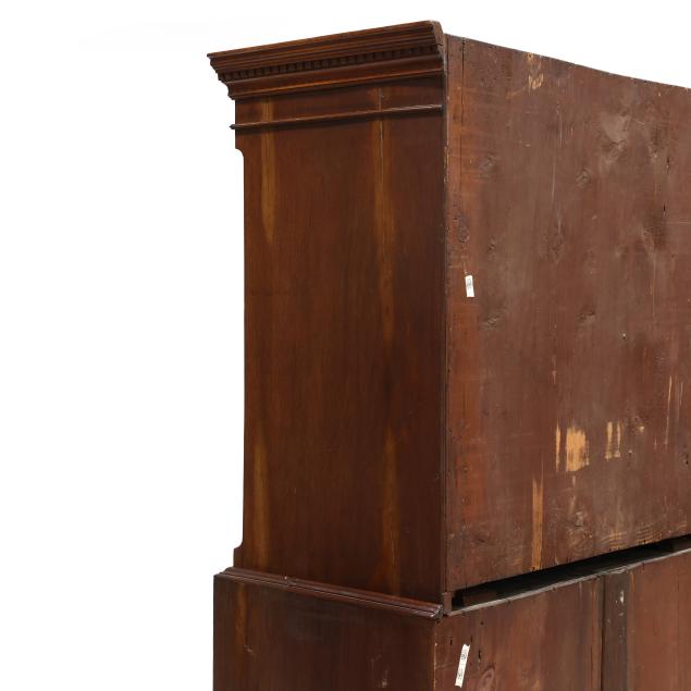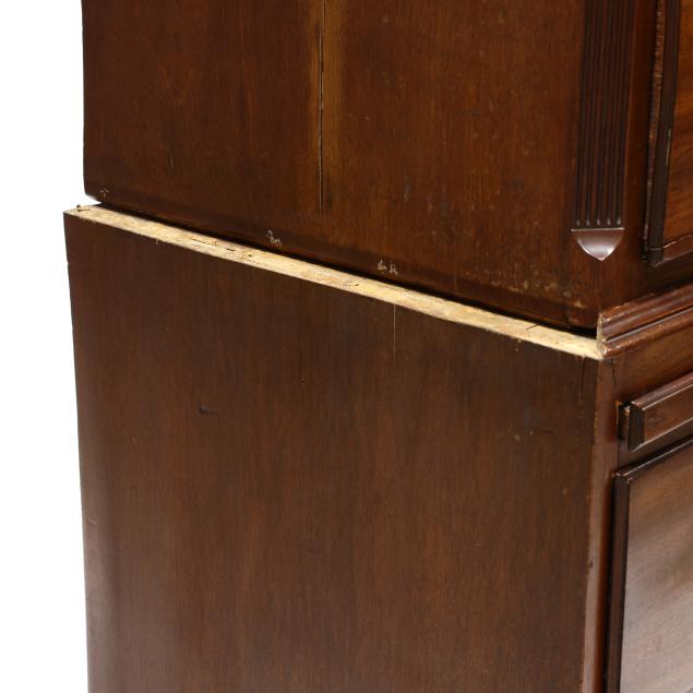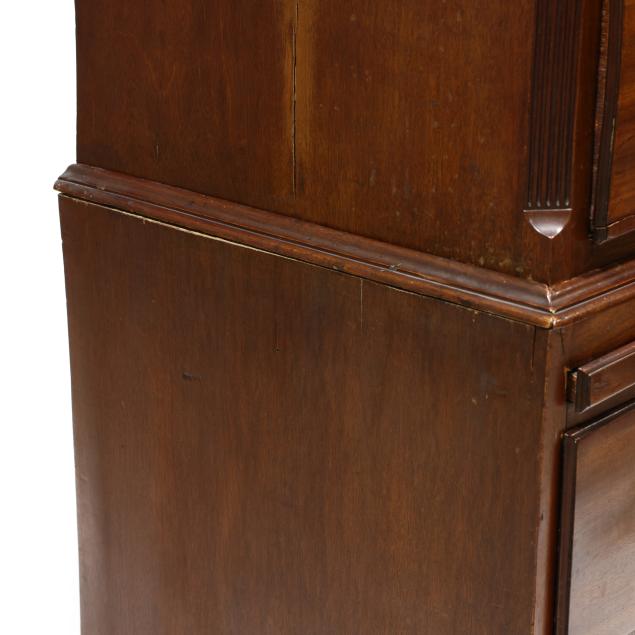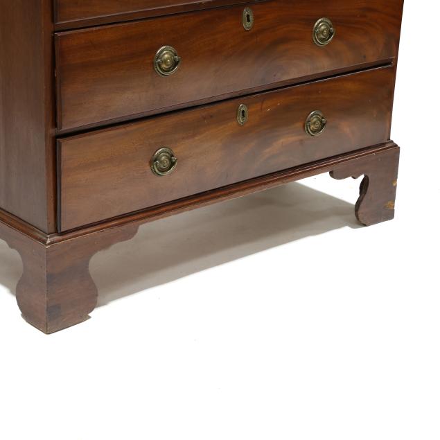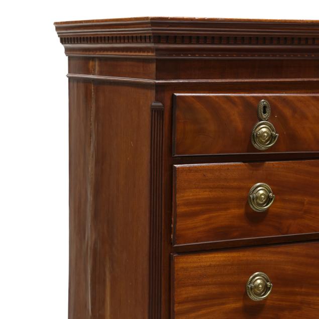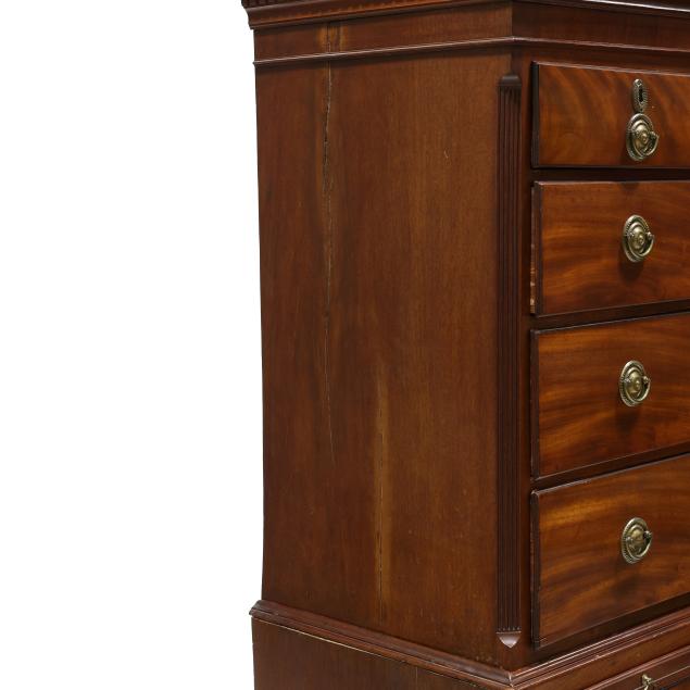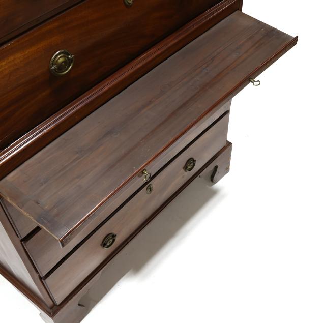 Circa 1800, mahogany veneer, oak and pine secondary, two part form, dovetailed case, dentil molded cornice, over six graduated lipped drawers, the upper case with fluted canted corners and the lower case with a dressing slide, straight bracket foot base.