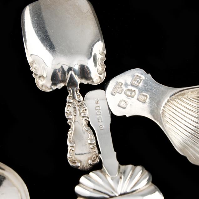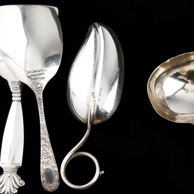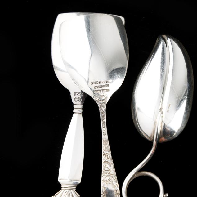 Baltimore Rose spoon; a sterling leaf form spoon (medicine spoon?); a William IV