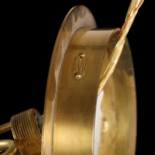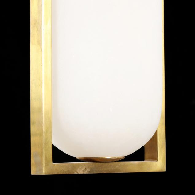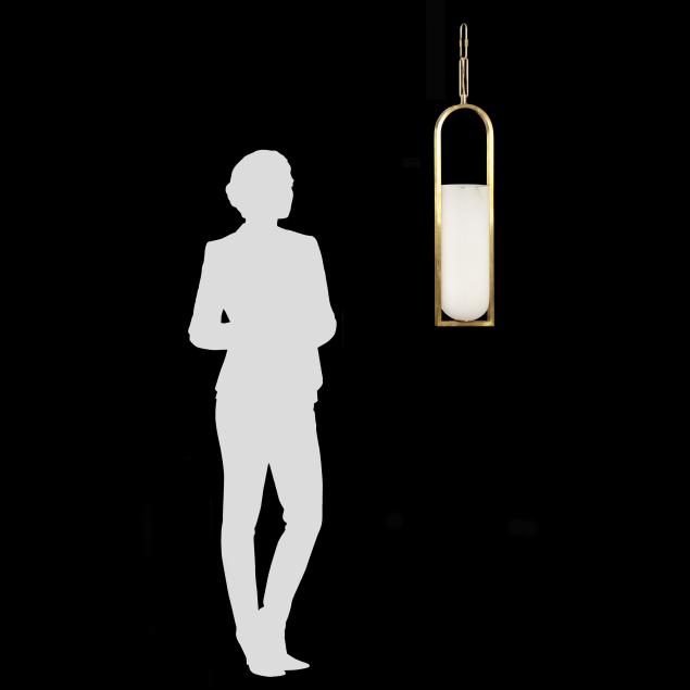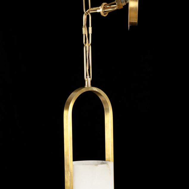 Contemporary, brushed brass and alabaster, single light form, with ceiling cap and chain, labeled.