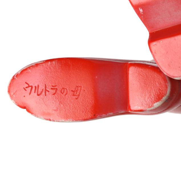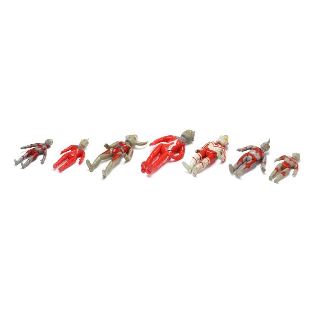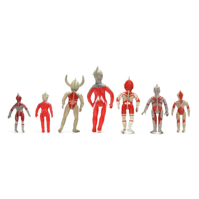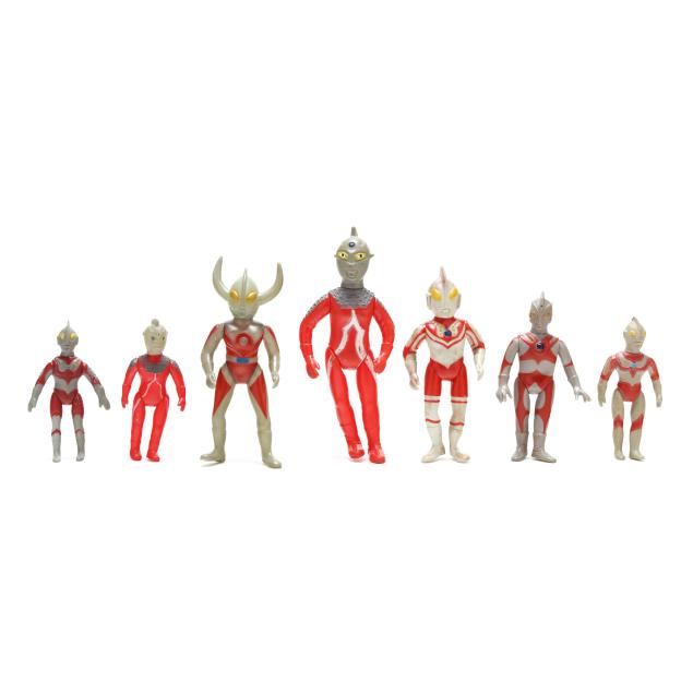 sofubi) figures by Bullmark to include a large Mother of Ultraman figure (12 x 5 x 3 1/2 in.), a large Ultraman Leo figure (12 x 5 x 3 1/2 in.), a small Father of Ultraman figure (8 x 3 1/2 x 2 1/2 in.), a small Ultraman Ace figure, (2) Ultraseven figures (taller 9 x 4 1/4 x 2 in., smaller 5 3/4 x 2 3/4 x 1 1/2 in.), (2) small Ultraman Zoffy figures (both approximately 5 3/4 x 2 3/4 x 1 1/2 in.), and a small Return of Ultraman (Jack) figure (6 3/4 x 2 3/4 x 1 1/2 in.), all variously marked to feet.