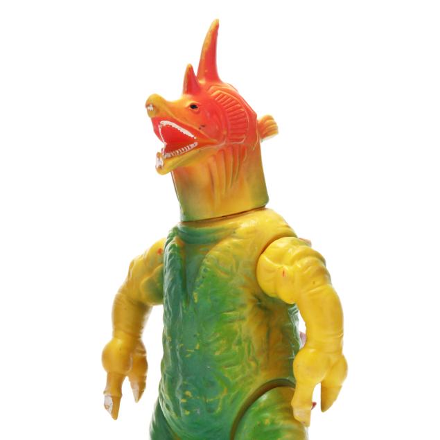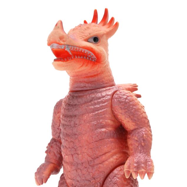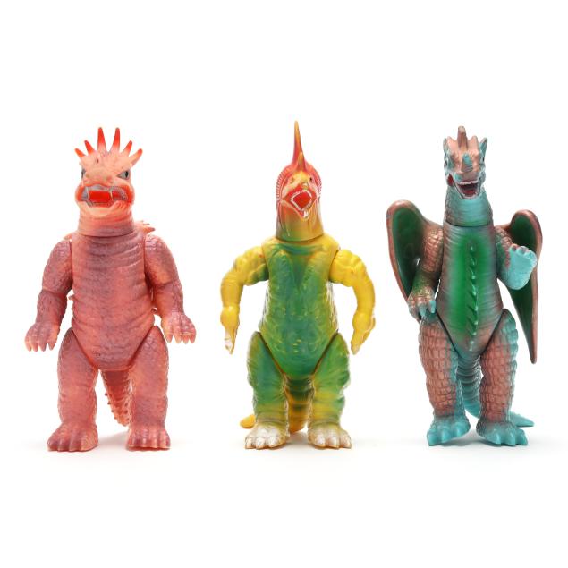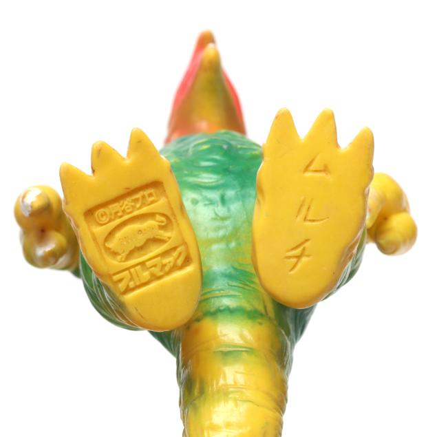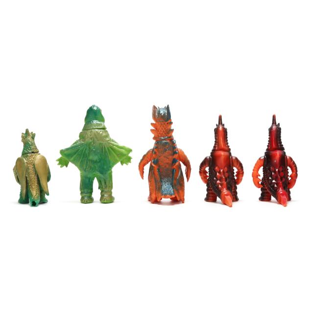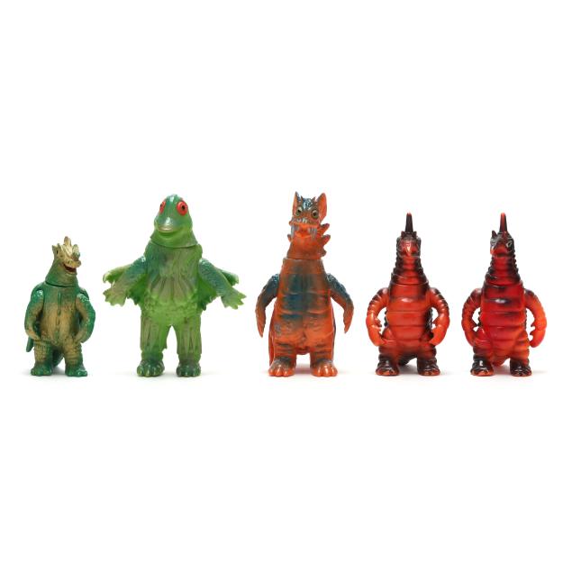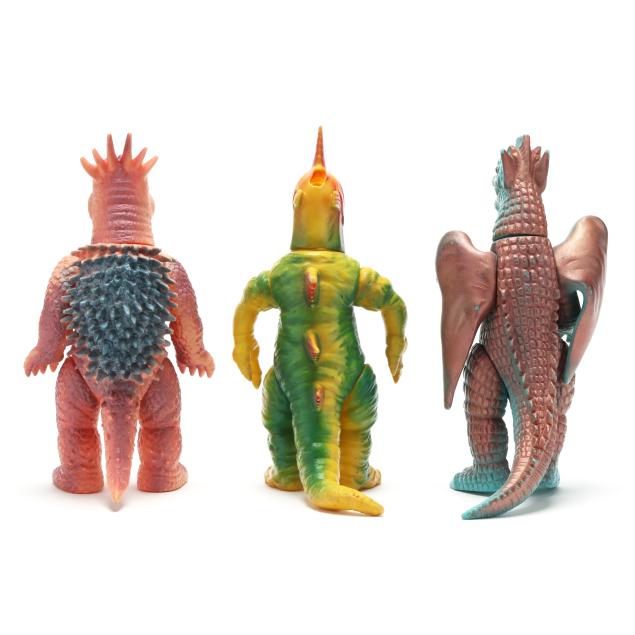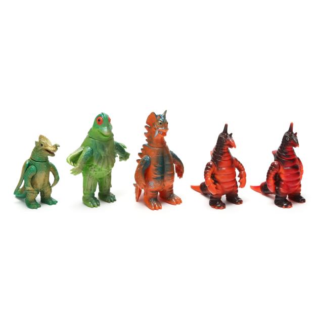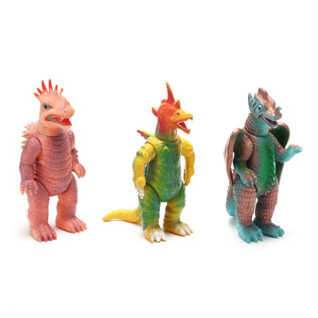 sofubi) monster figures, several from the Ultraman franchise, the three larger figures include: a Muruchi figure (9 1/2 x 4 1/2 x 5 1/2 in.), an Anguirus figure (9 1/4 x 4 1/2 x 5 in.), and a Chameleking figure (9 x 4 1/2 x 5 in.), all with BULLMARK company marks to feet undersides.