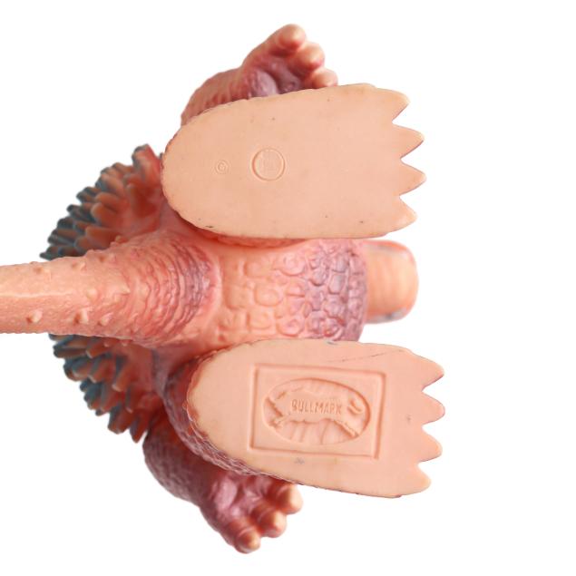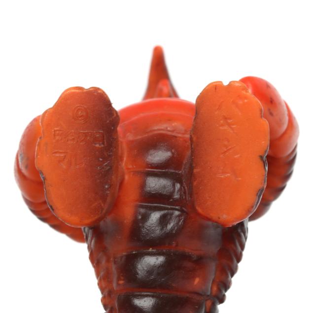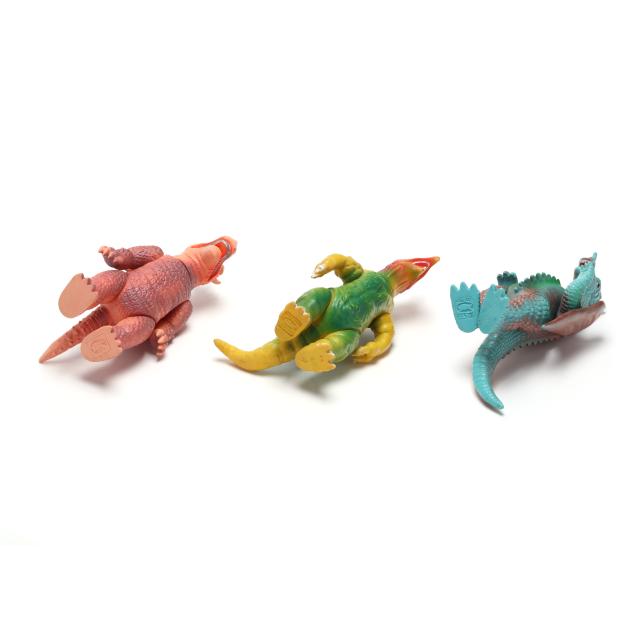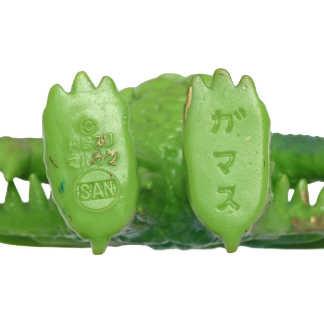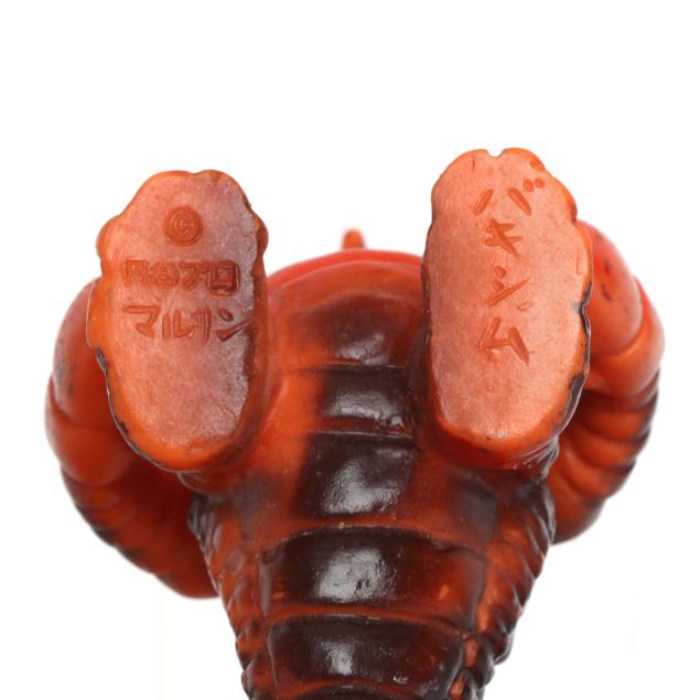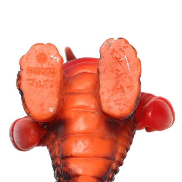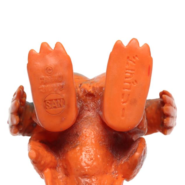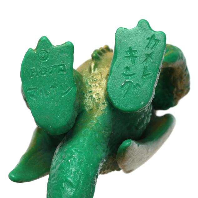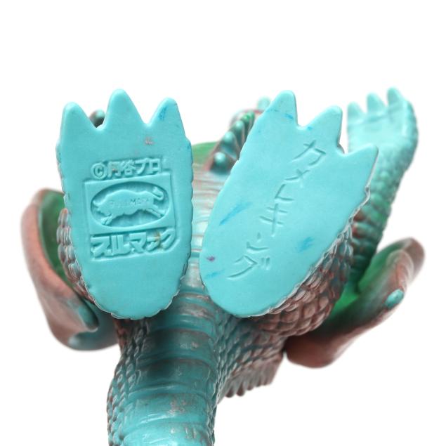 sofubi) monster figures, several from the Ultraman franchise, the three larger figures include: a Muruchi figure (9 1/2 x 4 1/2 x 5 1/2 in.), an Anguirus figure (9 1/4 x 4 1/2 x 5 in.), and a Chameleking figure (9 x 4 1/2 x 5 in.), all with BULLMARK company marks to feet undersides.