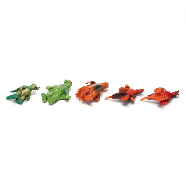 The smaller figures include: (2) Vakishim figures (4 3/4 x 2 1/2 x 3 3/4 in.) , a Doragory figure (5 1/4 x 3 x 3 in.), a Chameleking figure, and a Marusan monster, all marked variously to feet.