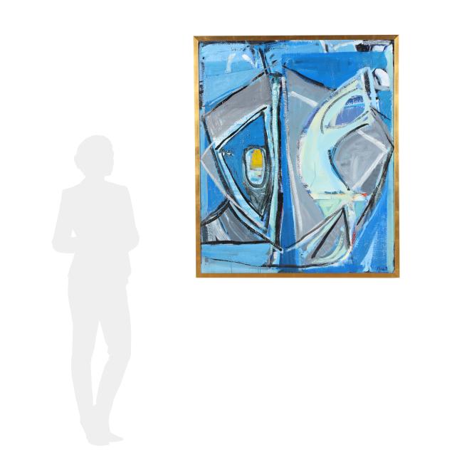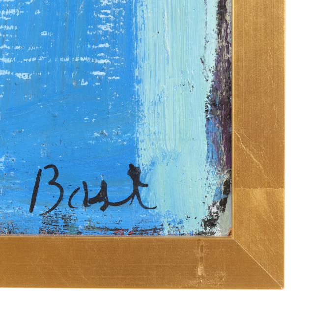 Acrylic on board, signed at lower right, with artist stamps to verso, framed.
