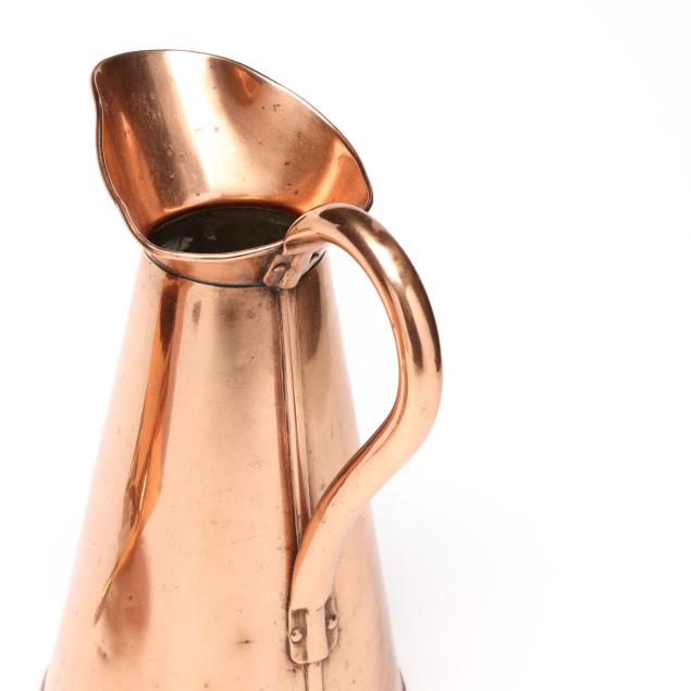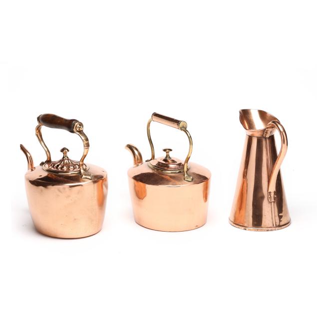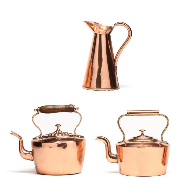 Mid-20th century, to include (1) pitcher, possible mark to underside no longer legible (8 3/4 x 6 5/8 x 5 in.), and (2) tea kettles, one with wood handle, both unmarked (taller 9 1/4 x 10 x 6 1/2 in.; shorter 8 3/4 x 10 x 6 1/2 in.).