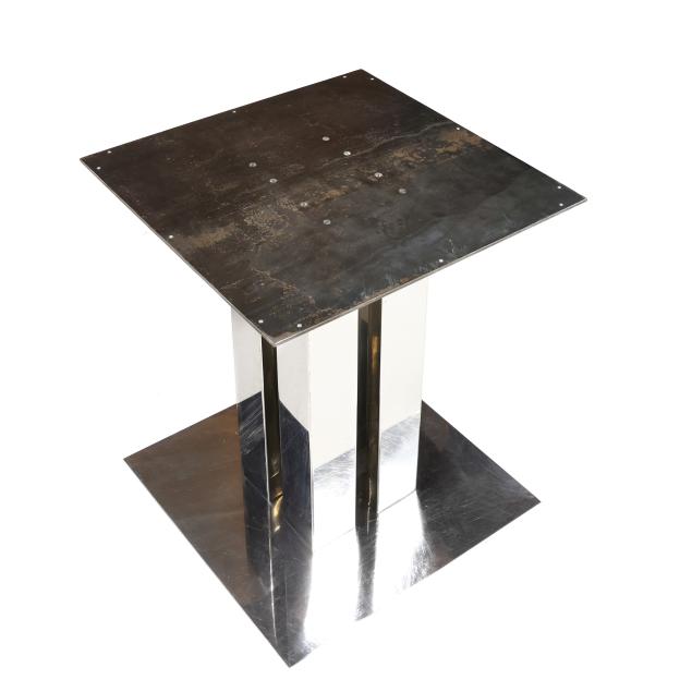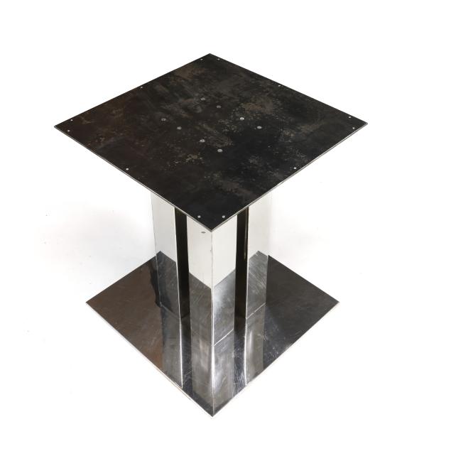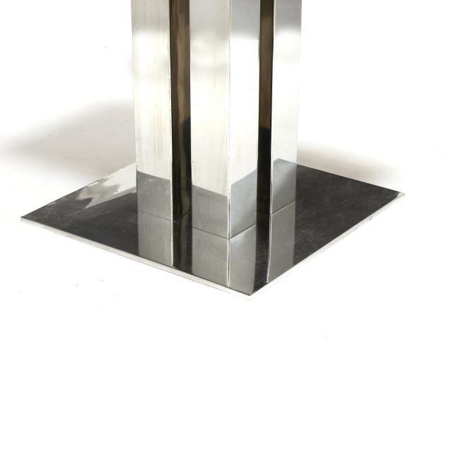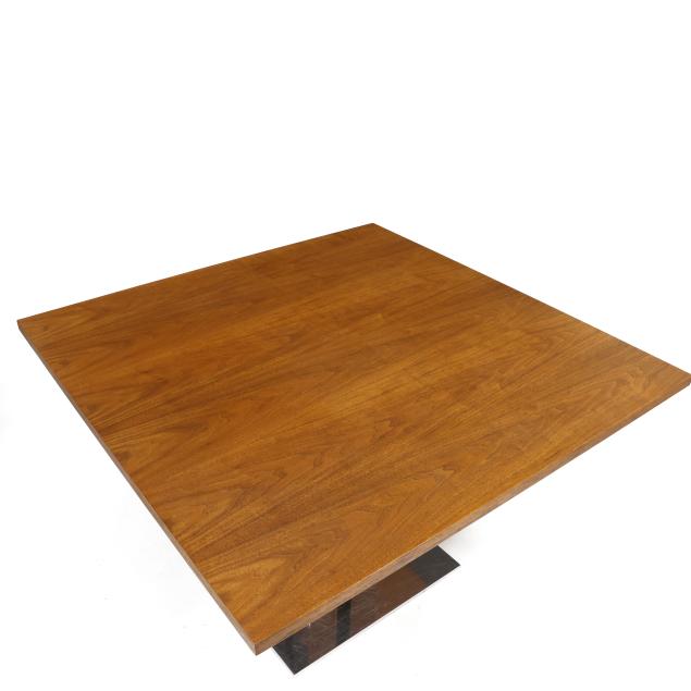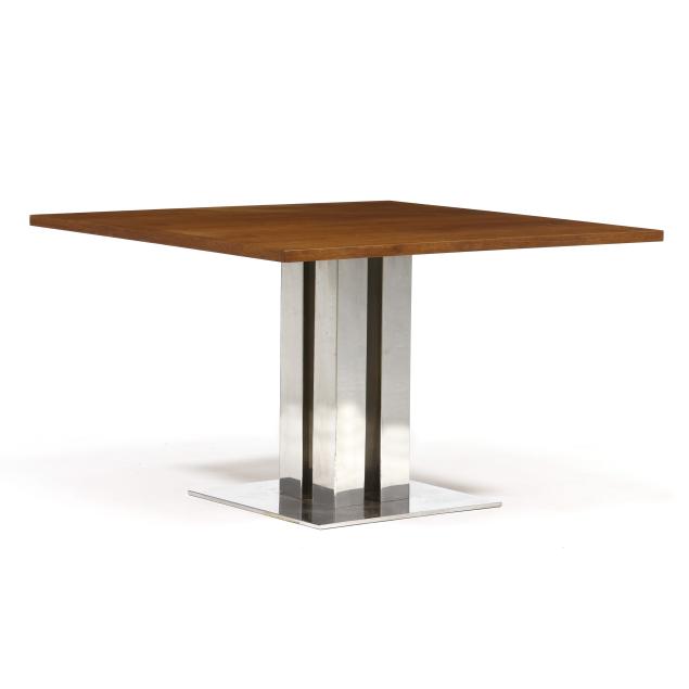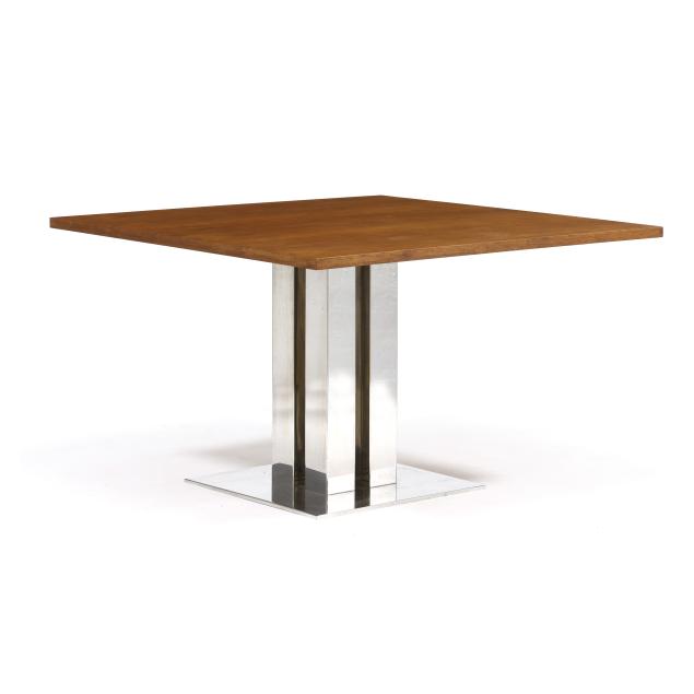 Circa 1970, for Pace Collection, walnut veneer square top over a polished steel pedestal, unmarked.