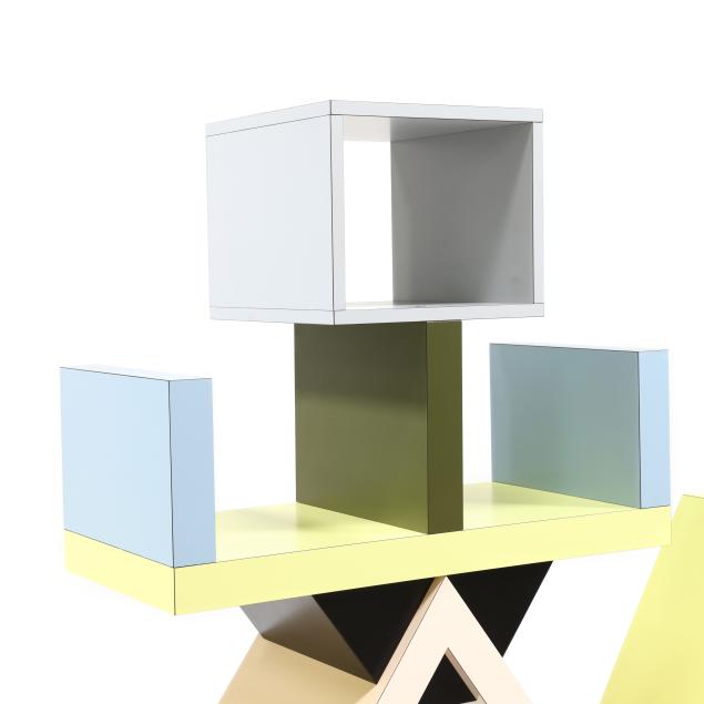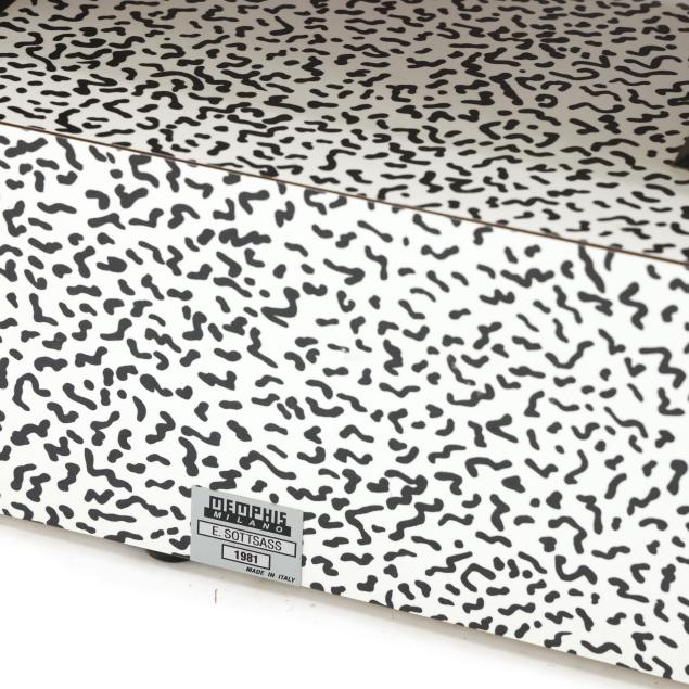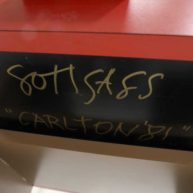 1981, multi-color laminate over MDF, four part bolted form with two drawers, flush base, finished to all sides, underside of bottom drawer signed in gold sharpie "Sottsass 'Carlton 81'" as well as labeled; accompanied with two sets of designer trading cards (one set featuring the "Carlton" to the lid).