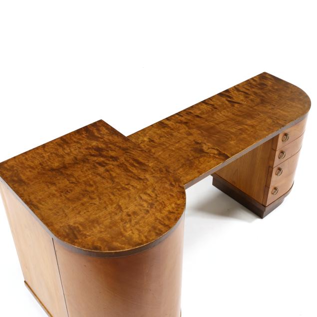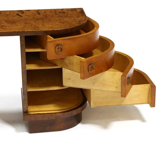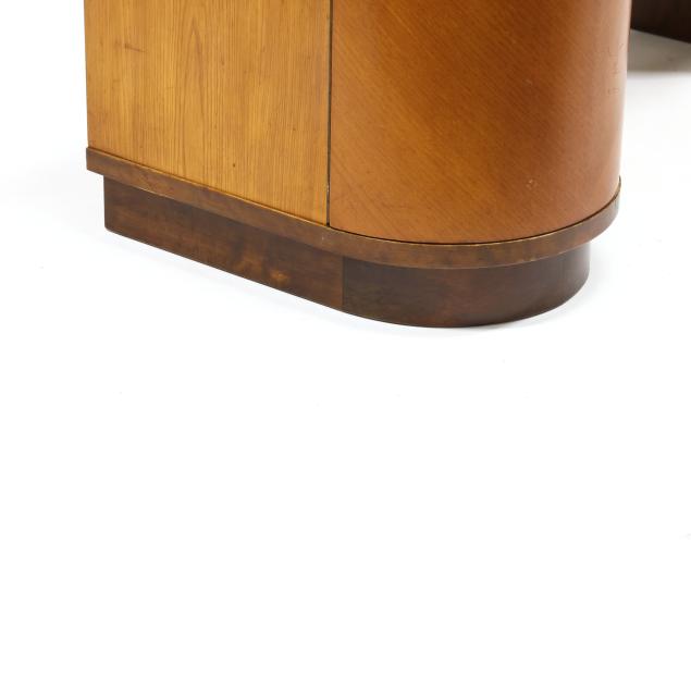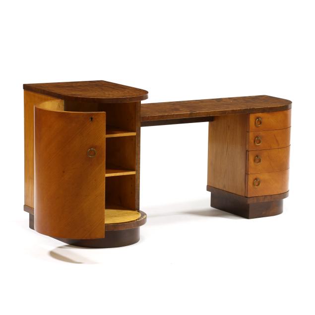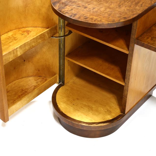 Circa 1930, burl wood and mixed wood veneers, stepped top with rounded corners, the left side with a hinged convex door, shelved interior, the right side with four graduated conforming hinged drawers, recessed flush base, labeled.